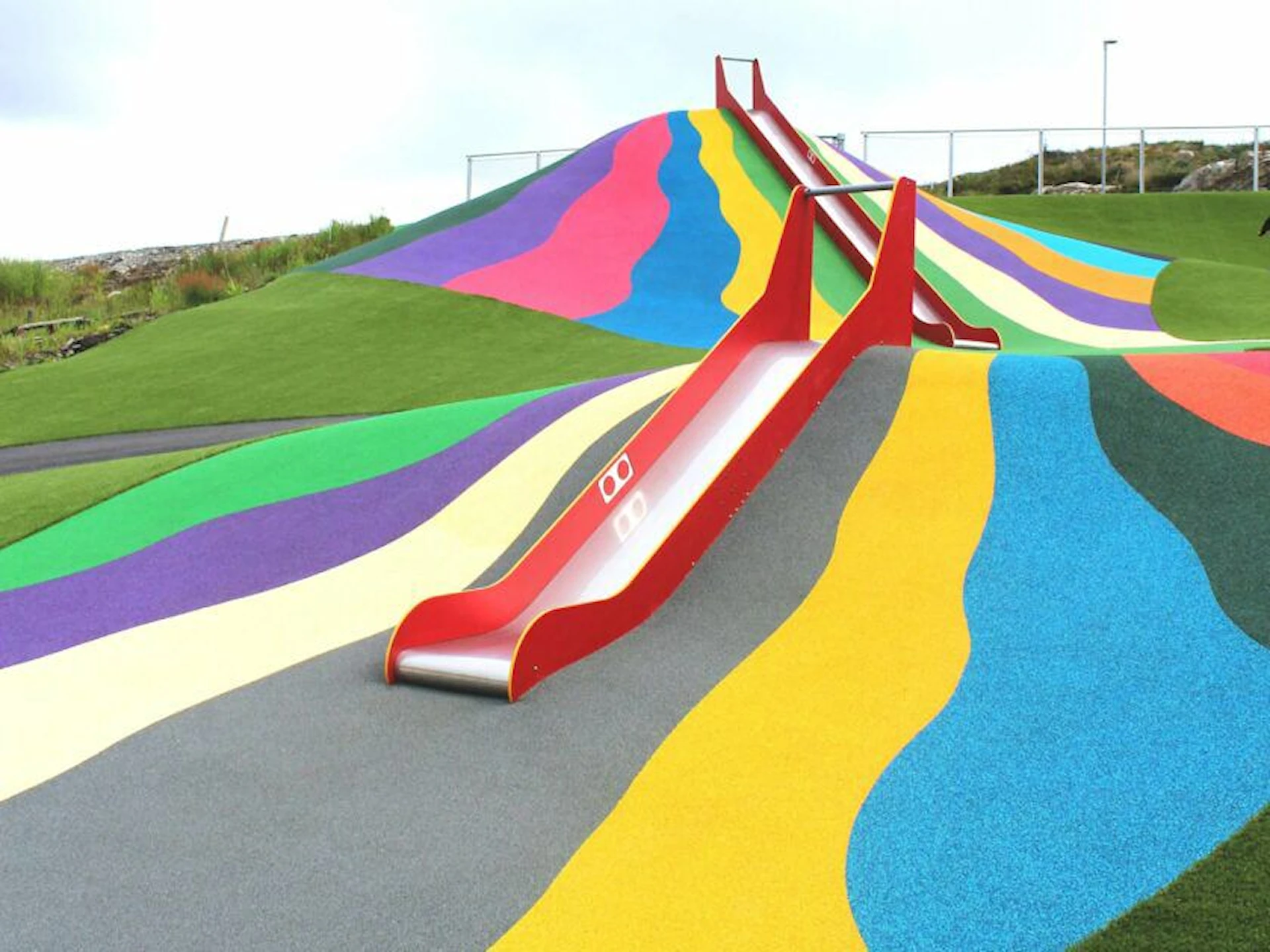Släntrutschar och fallskyddskrav – vad gäller? Rutsch är en tvingad rörelse och då är minsta kravet att underlaget ska klara fall om minst 100 cm, oavsett höjd för den tvingade rörelsen. Detta innebär att gräs/jord är godkänt vid utförsdelen. Vi rekommenderar dock att använda annat material just vid utförsdelen, för att det inte blir bra över tid. Konstgräs kan användas vid utförsdelen om man lägger en pad som klarar fall upp till 100 cm. Konstgräs utan pad vid utförsdelen är inte godkänt. Sidorna av rutschen och själva kullen kan dock kläs in med konstgräs utan pad. Där finns inget krav på fallskydd. Kullens sluttning behöver ha samma form som släntrutschen. Rutschkanan placeras parallellt med kullen: antingen direkt mot underlaget eller med en jämn marginal hela vägen på 300-400 mm.