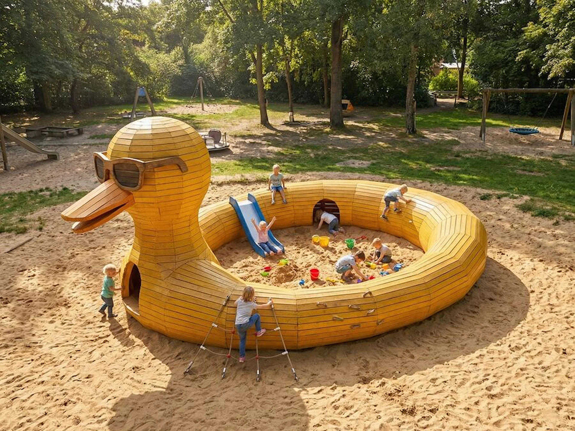 Leken fortsätter både inuti och runt konstruktionen. Amaze Ankan kan rymma rutschkana, klätteryta, replösning och sandlåda, vilket ger variation i både intensitet och uttryck. Sandytan gör dessutom lekplatsen tillgänglig även för de allra yngsta barnen, medan äldre barn lockas av höjd, rörelse och de mer utmanande momenten.