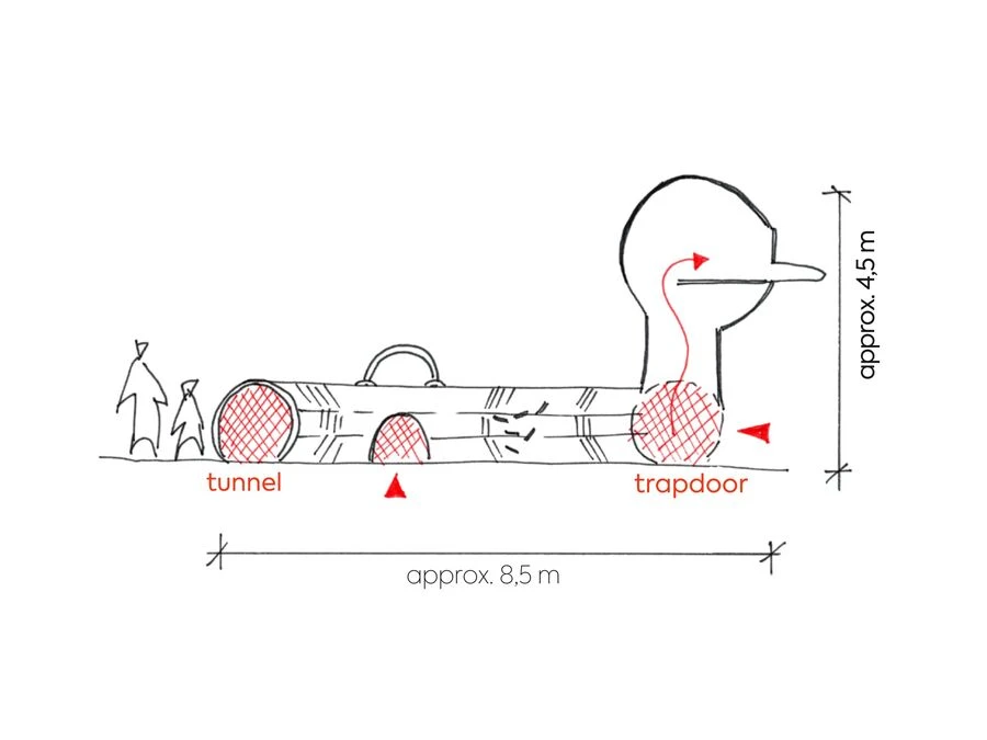 Under den lekfulla ytan döljer sig en rik värld av aktiviteter. Runt hela ankans kropp löper en kryptunnel som bjuder in till rörelse, upptäckande och rollekar. Från tunneln kan barnen ta sig upp mot ankans huvud, där ett interaktivt moment väntar – en mekanism som gör det möjligt att öppna och stänga näbben. Ett enkelt grepp som skapar förvånansvärt mycket engagemang.