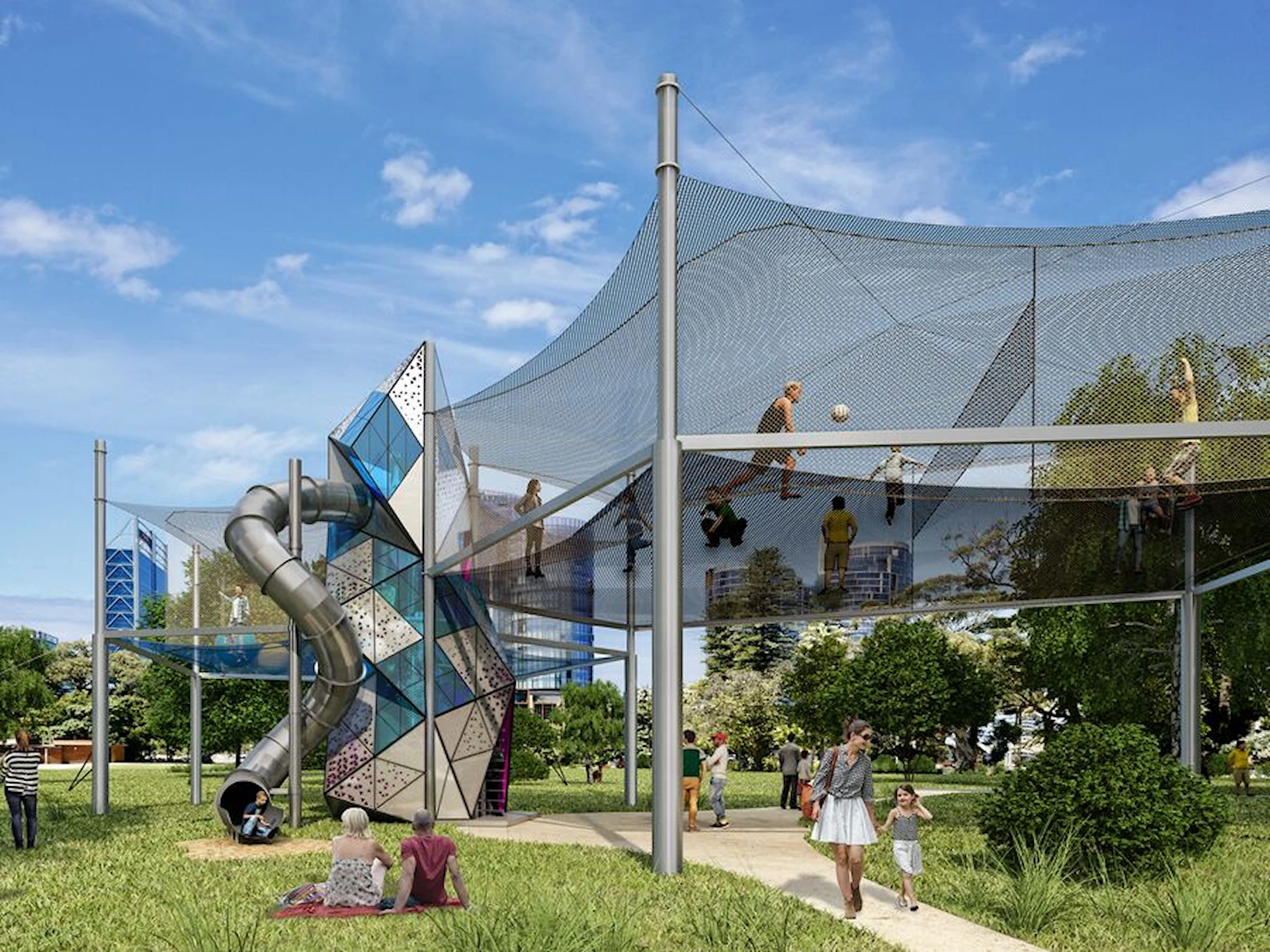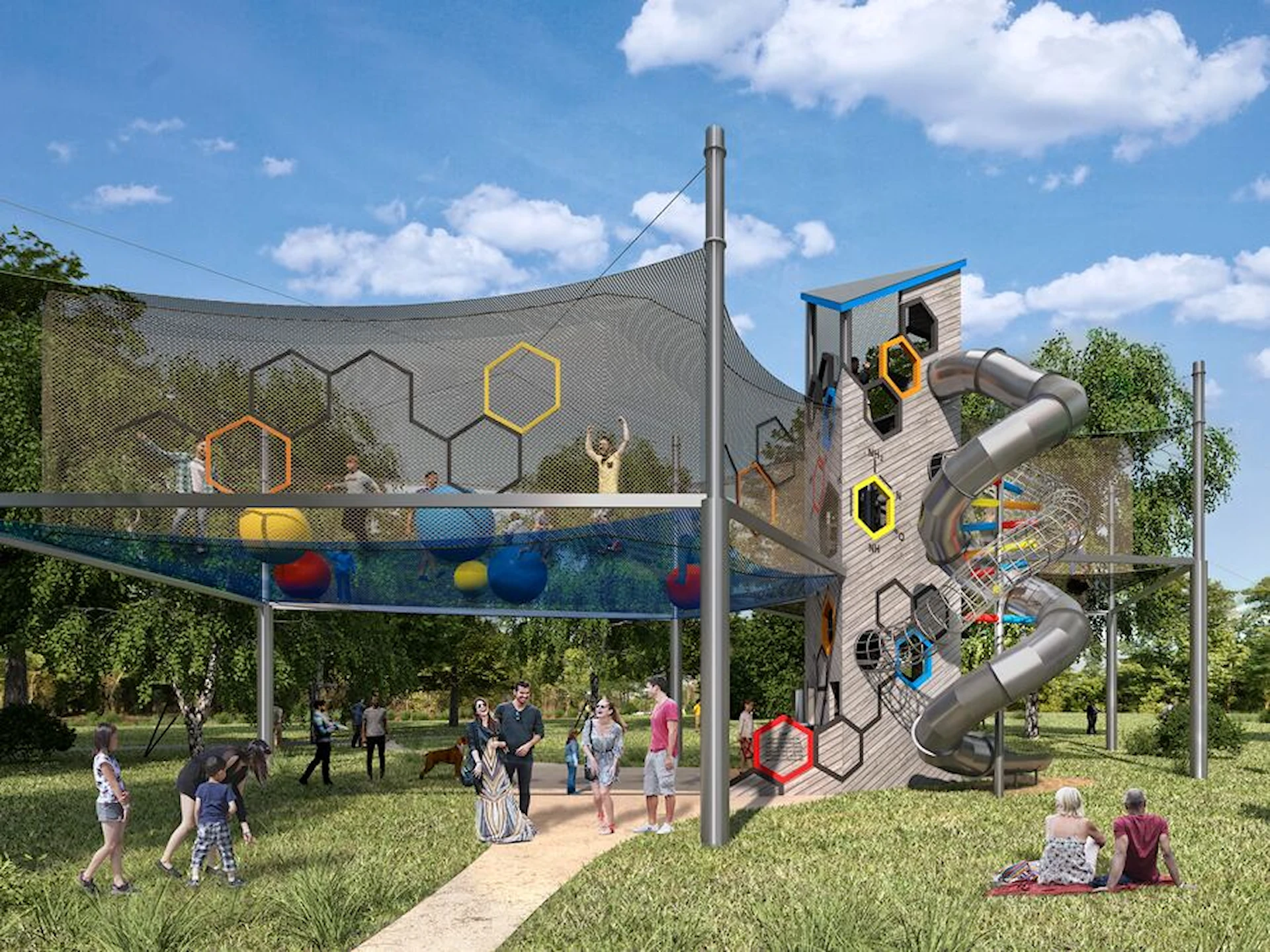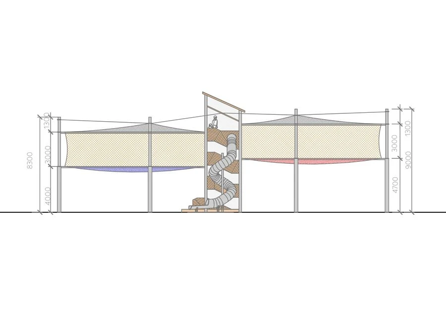 Anläggningen består av två separata nätzoner för lek och studs, sammanlänkade med ett entrétorn utformat som en triangulär prisma. Tornet blir en visuell signatur i landskapet och kan anpassas i olika designutföranden. Uppstigningen behöver inte ske via traditionella trappor – istället kan stegar, träplattformar eller ett nätklättersystem utgöra själva vägen upp till en del av äventyret.