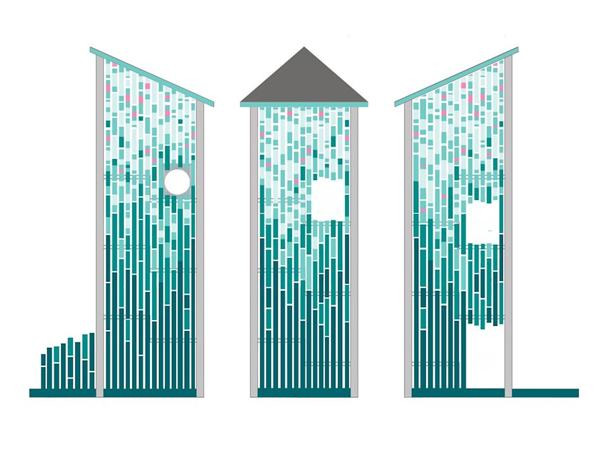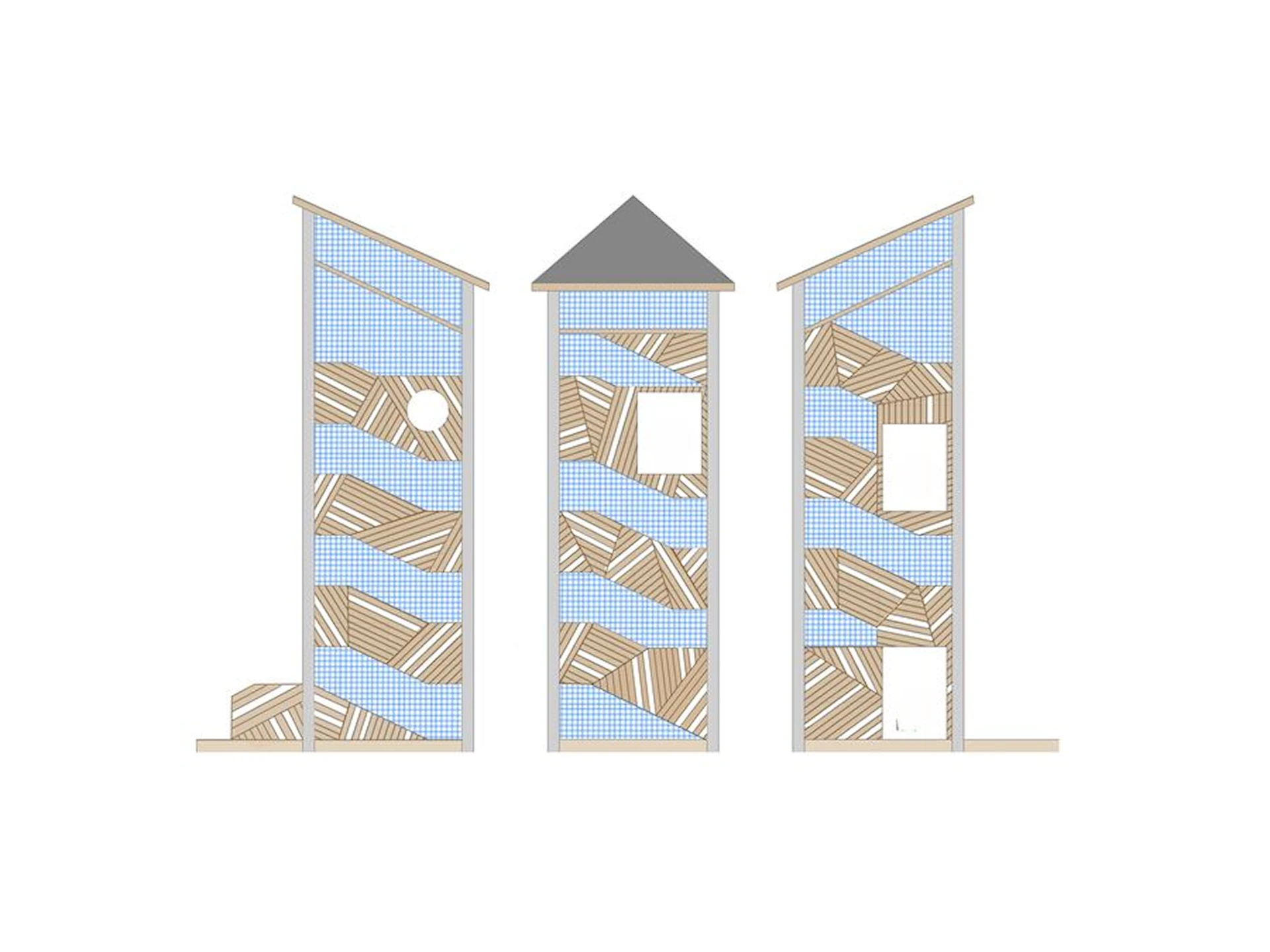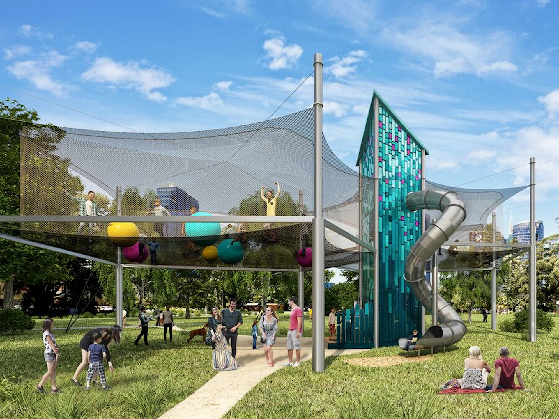 Anläggningen består av två separata nätzoner för lek och studs, sammanlänkade med ett entrétorn utformat som en triangulär prisma. Tornet blir en visuell signatur i landskapet och kan anpassas i olika designutföranden. Uppstigningen behöver inte ske via traditionella trappor – istället kan stegar, träplattformar eller ett nätklättersystem utgöra själva vägen upp till en del av äventyret.