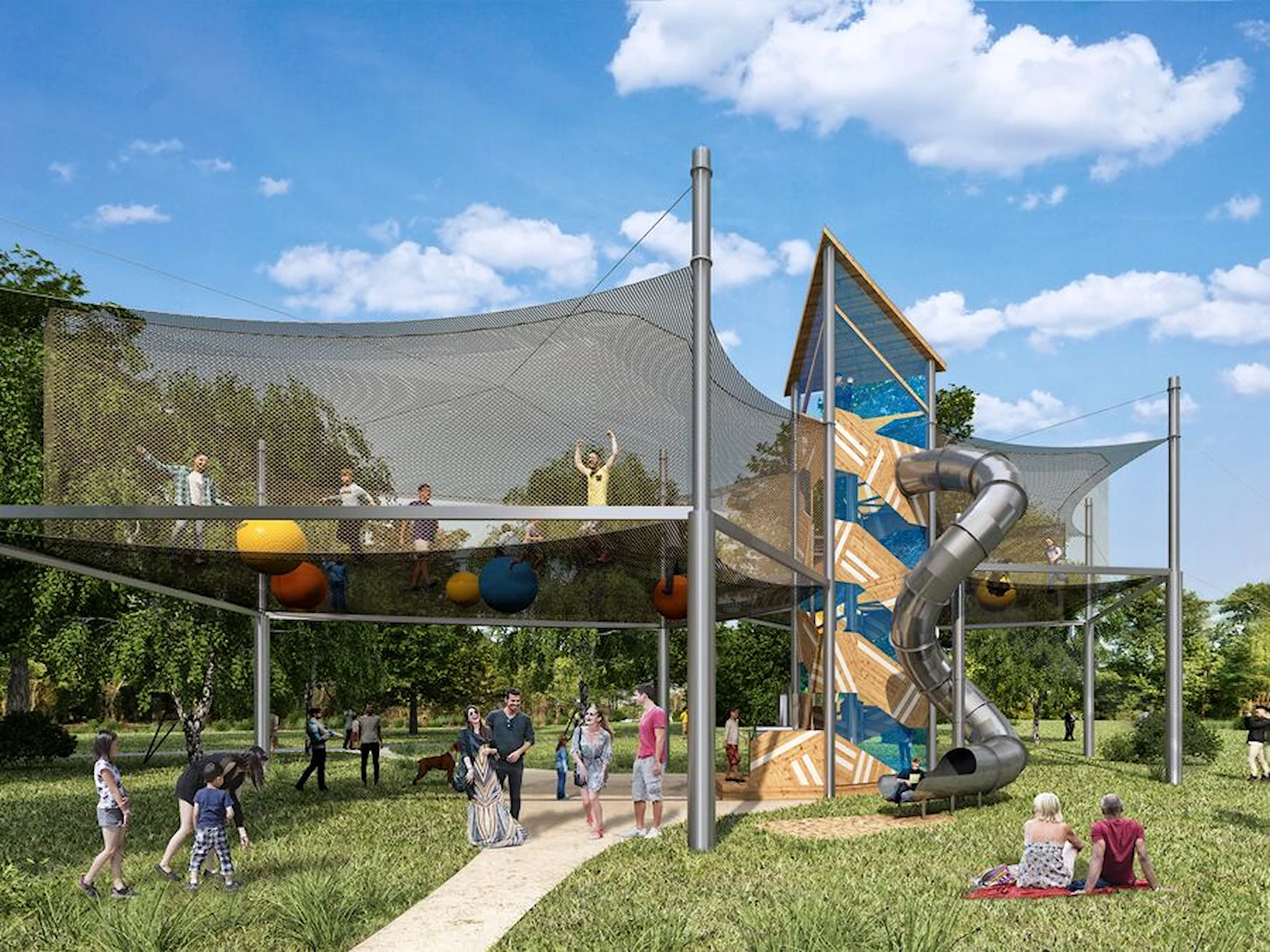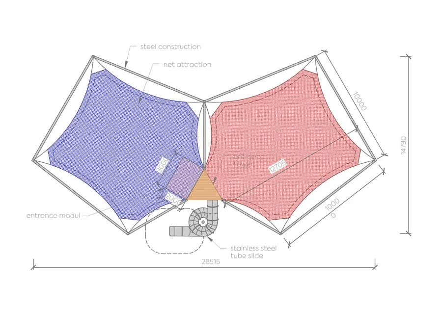Från toppen leder en tubrutschkana ner till marken och ger en snabb och lekfull avslutning på upplevelsen. För en extra dimension kan näten fyllas med gummibollar i olika storlekar, vilket förstärker känslan av rörelse och lek.