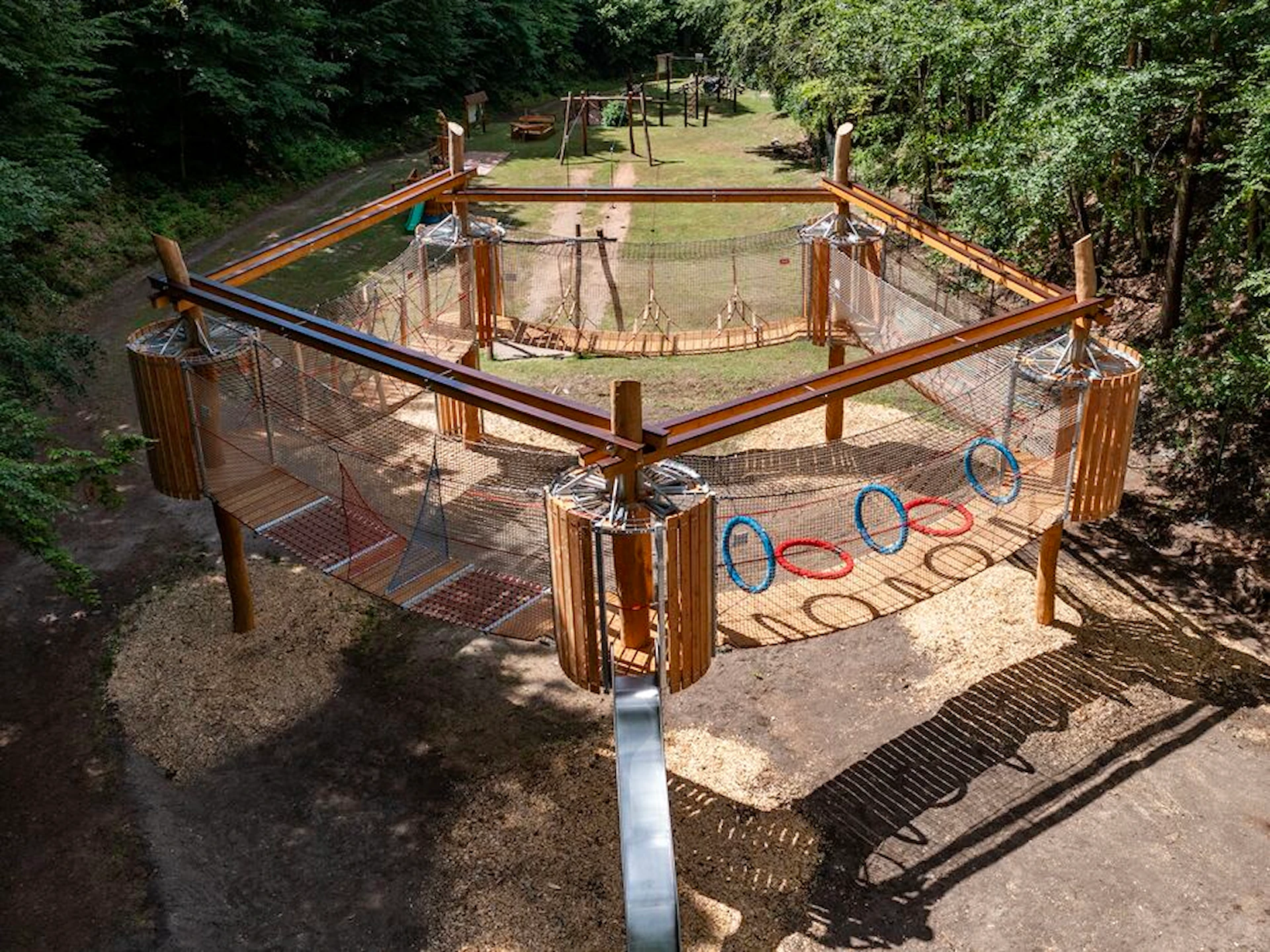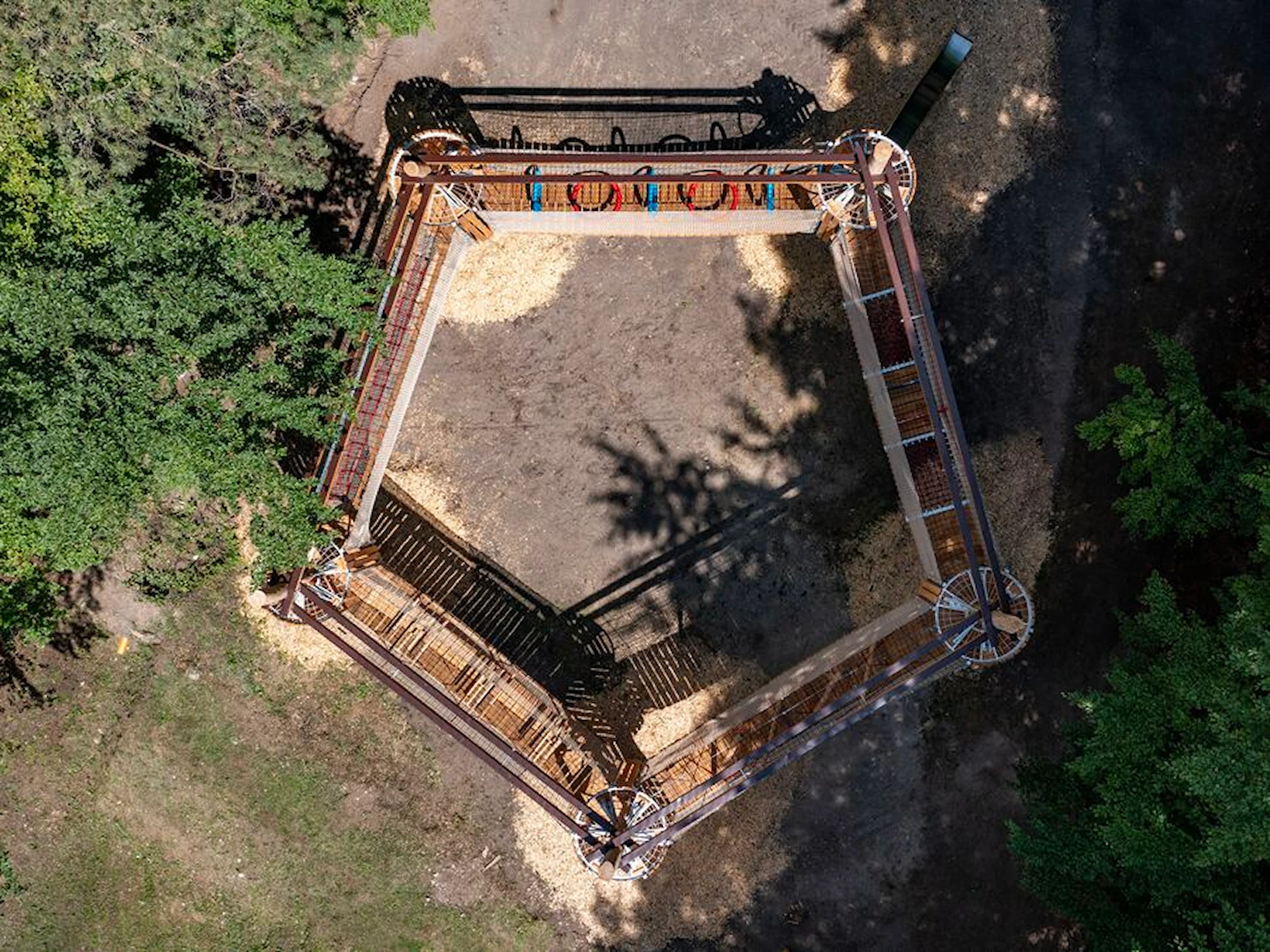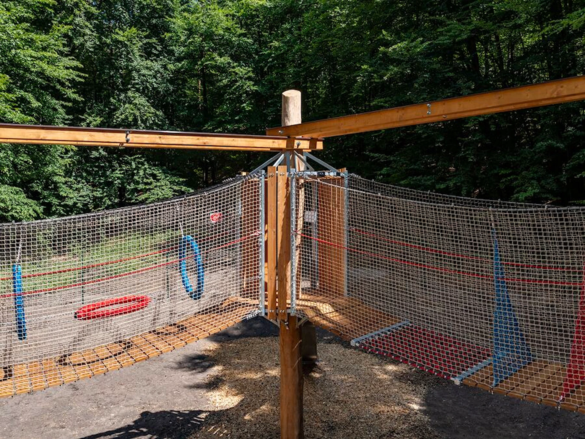 Trots sitt mindre format erbjuder Amaze Pentagon en dynamisk lekupplevelse. De fem hindren utmanar koordination, styrka och samarbete – och den öppna nätstrukturen ger både trygghet och överblick. Konstruktionen blir ett visuellt blickfång samtidigt som den integreras naturligt i park- och skogsmiljöer.
