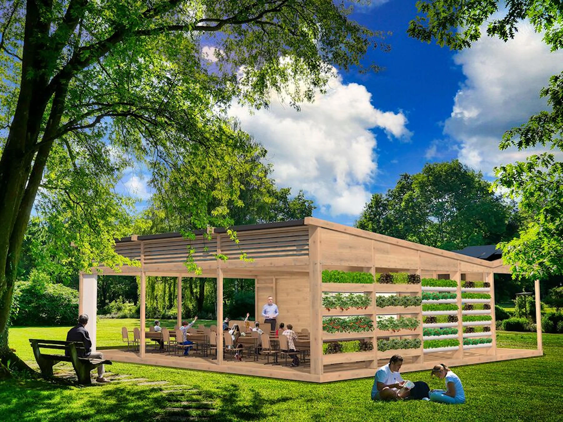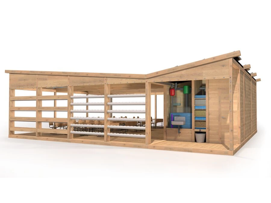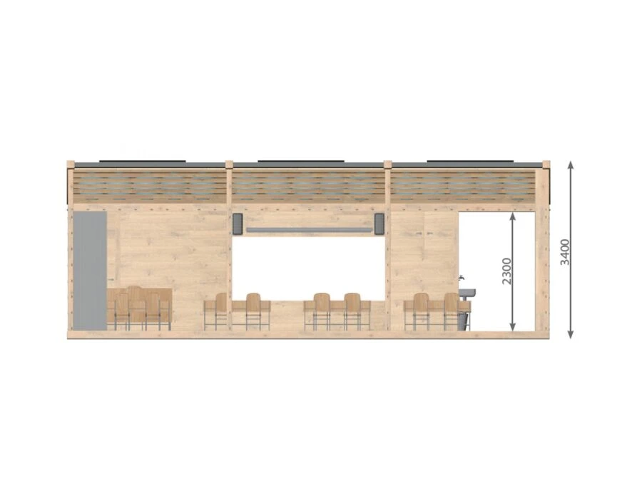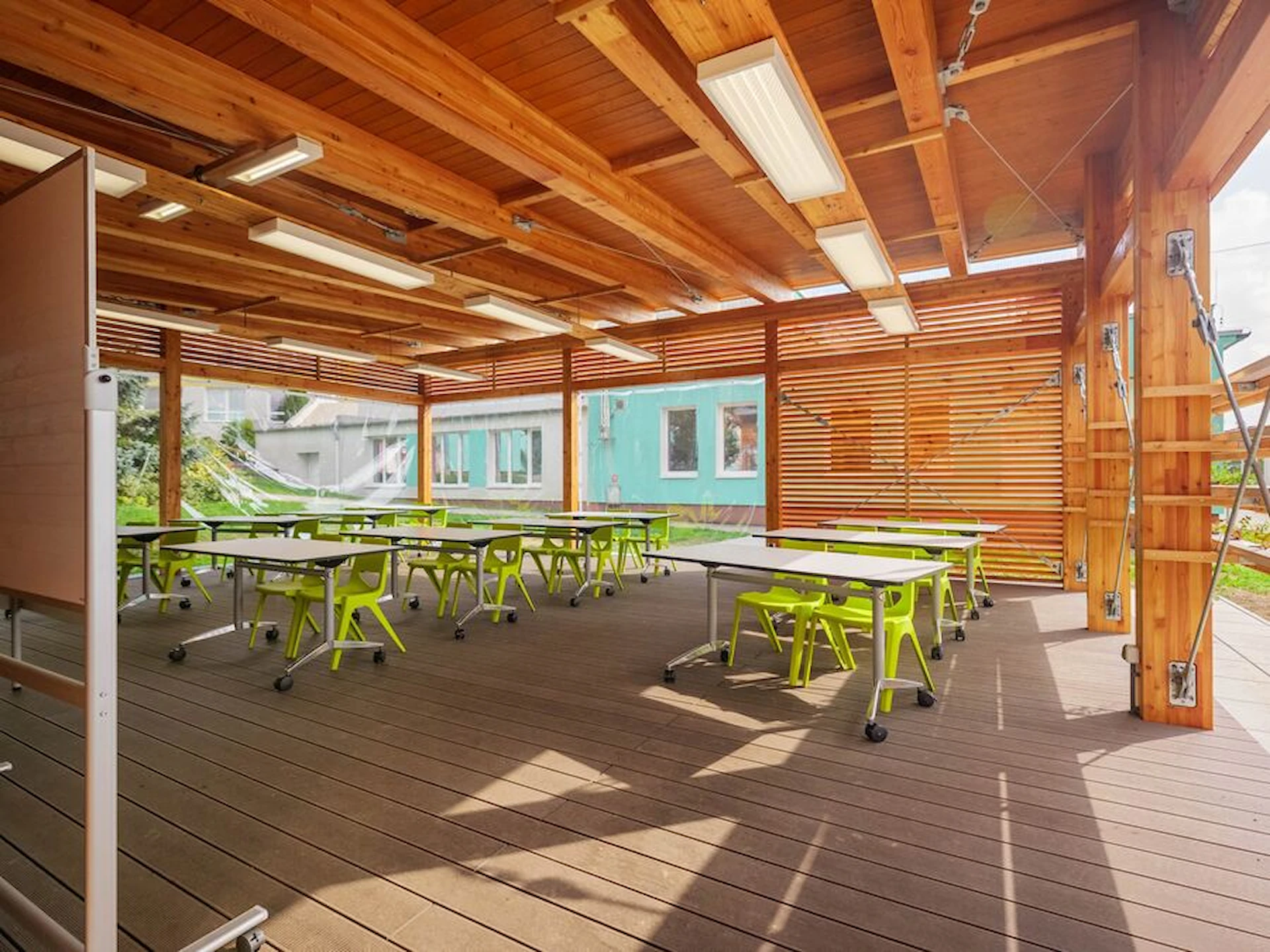 Uteklassrummet ger skydd mot väder och vind, samtidigt som den öppna strukturen skapar närhet till omgivningen. Den generösa undervisningsytan stödjer daglig skolundervisning, grupparbeten och tematiska projekt, medan integrerade tekniklösningar ger möjlighet att arbeta ämnesövergripande med exempelvis naturkunskap, teknik, samhällskunskap och design.