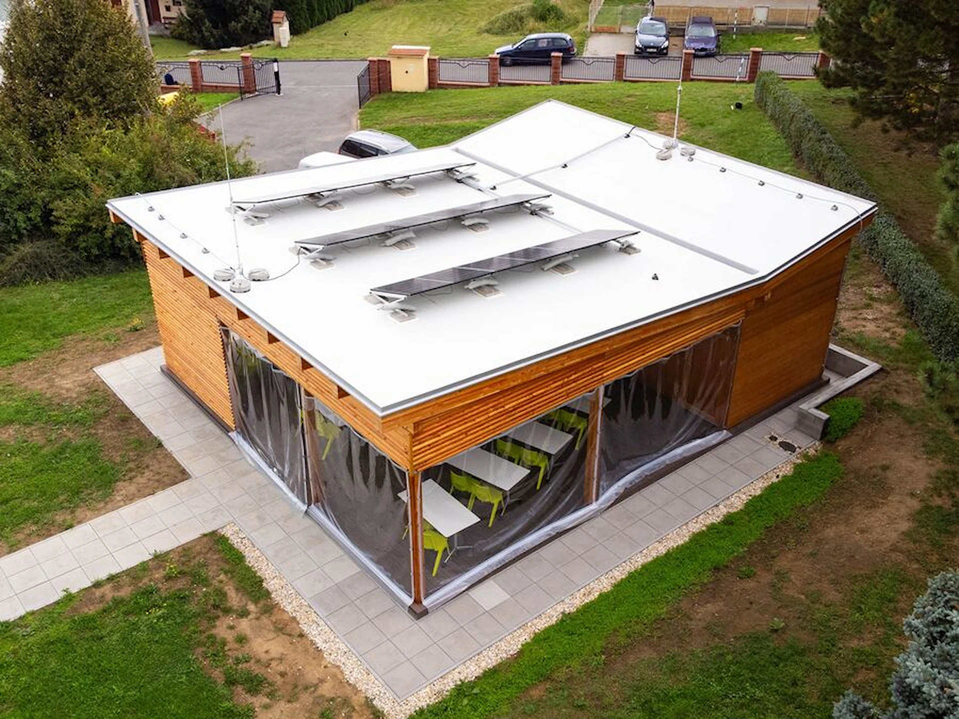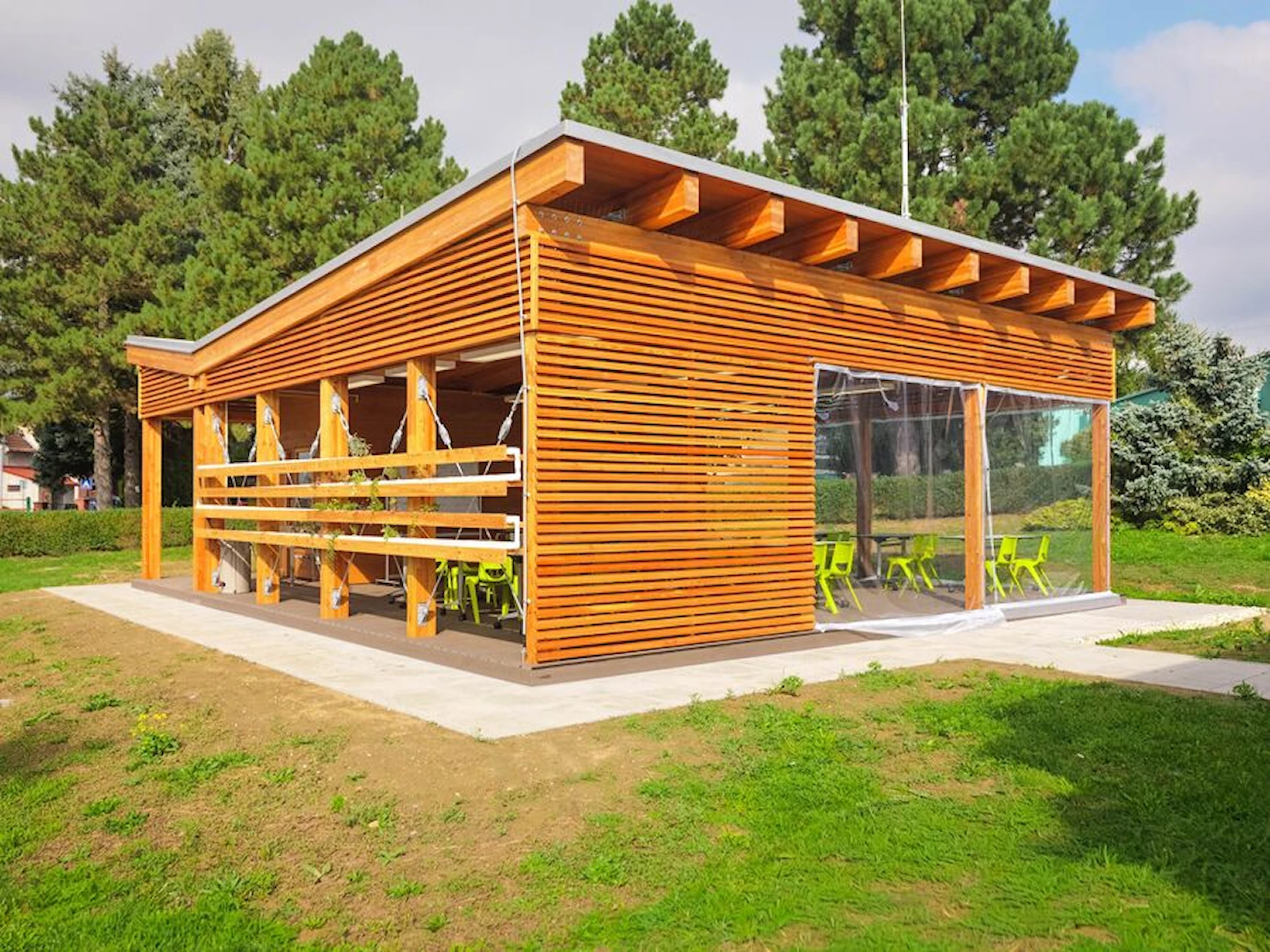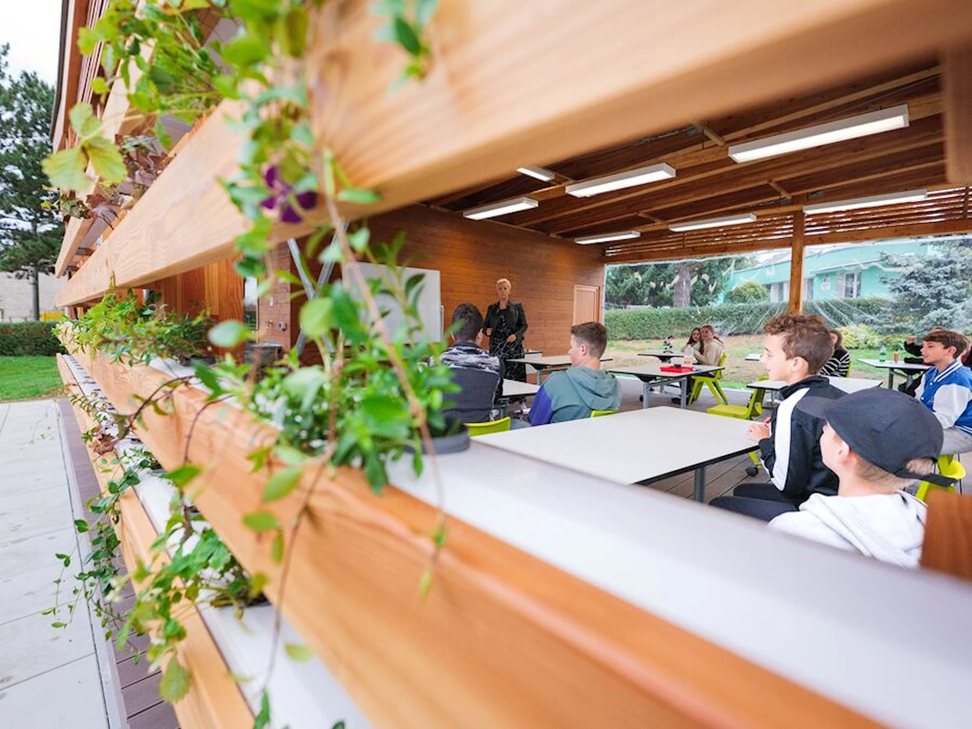 Uteklassrummet ger skydd mot väder och vind, samtidigt som den öppna strukturen skapar närhet till omgivningen. Den generösa undervisningsytan stödjer daglig skolundervisning, grupparbeten och tematiska projekt, medan integrerade tekniklösningar ger möjlighet att arbeta ämnesövergripande med exempelvis naturkunskap, teknik, samhällskunskap och design.