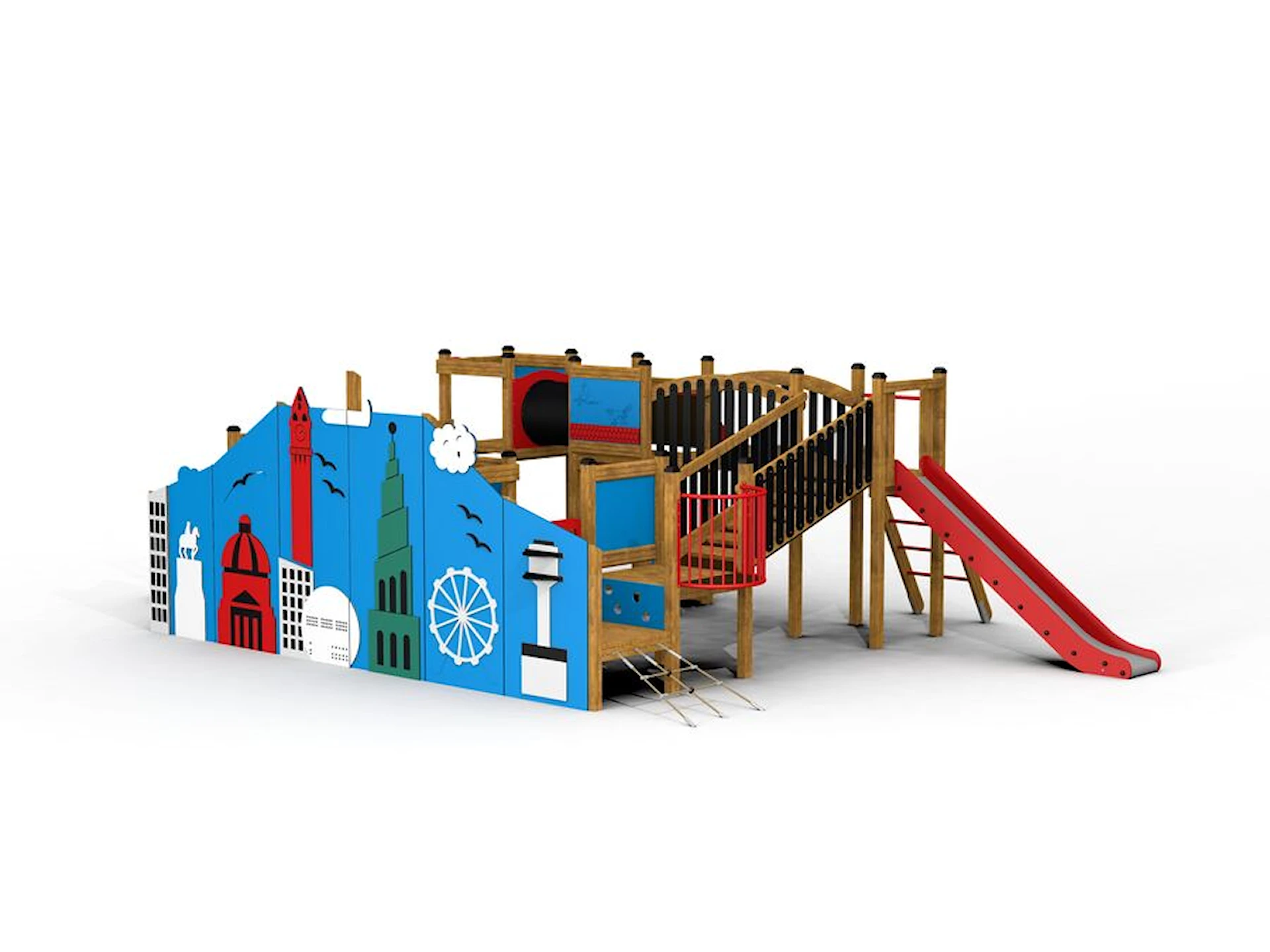 Lekställningen är byggd i slitstarka material som tål tuff lek och många års användning. De lekfulla färgerna och de detaljerade stadspanelerna gör att Staden blir en attraktiv mittpunkt i utemiljön – en plats dit barnen alltid vill återvända.