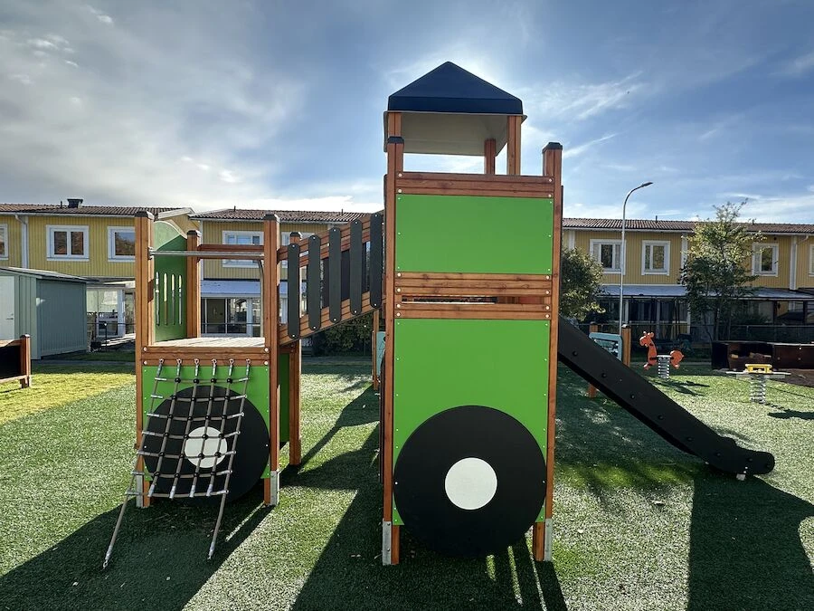 Däremot har vi många produkter utan trä som kan levereras i stort sett omgående, exempelvis Boulder Rocks, gungor, mål, basket, bordtennis, fristående rutschar, klätternät, studsmattor, bänkbord med mera.