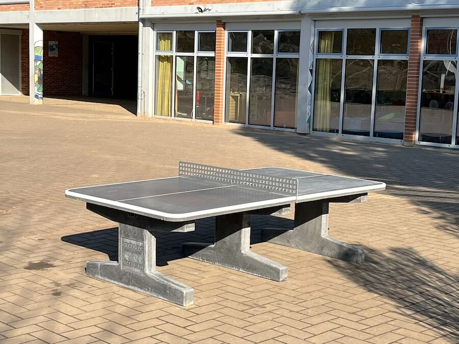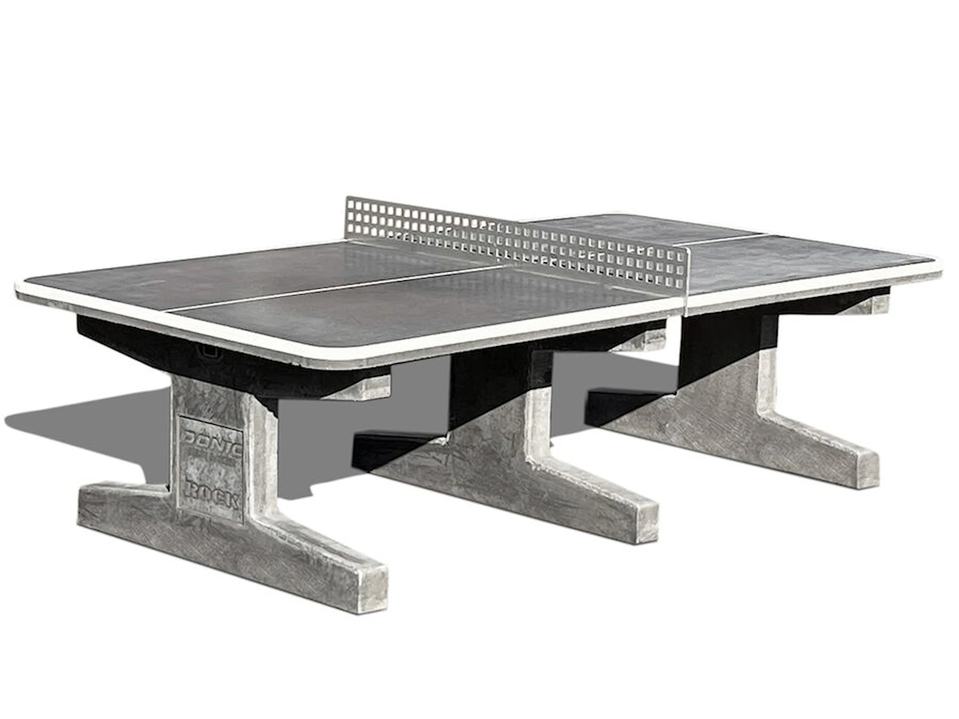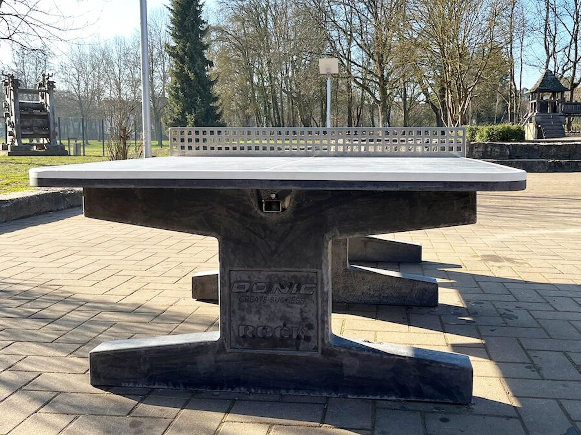 De tre massiva betongfötterna är förankrade med en robust stålskena under spelplattan. På plats väger betongbordet nästan ett ton, så det kan vara fristående så länge det står på ett plant och stabilt underlag.