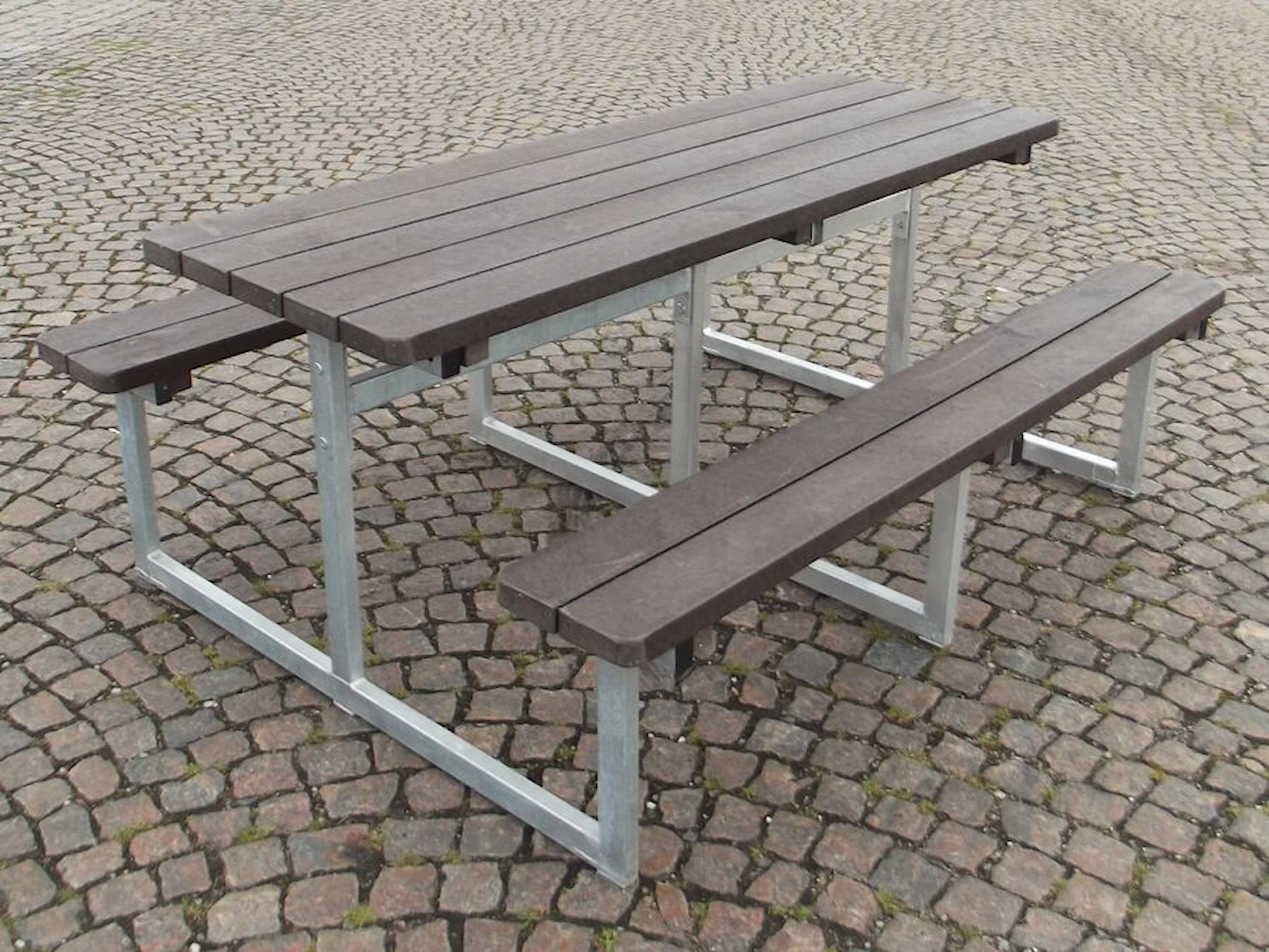 De massiva plankorna i genomfärgad plast är 100 % underhållsfria, tål alla slags väder och har en fin träliknande struktur. Plankorna mäter 120 x 40 mm, har rundade hörn och är vattenavvisande, extremt robusta och helt splitterfria. Bänkbordet kan levereras i färgerna grå, brun, grön eller svart, där grå är standard.