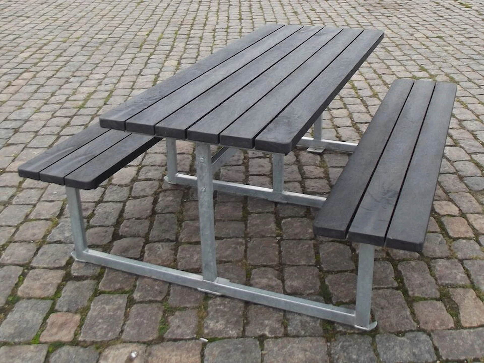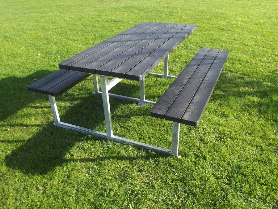 De massiva plankorna i genomfärgad plast är 100 % underhållsfria, tål alla slags väder och har en fin träliknande struktur. Plankorna mäter 120 x 40 mm, har rundade hörn och är vattenavvisande, extremt robusta och helt splitterfria. Bänkbordet kan levereras i färgerna grå, brun, grön eller svart, där grå är standard.