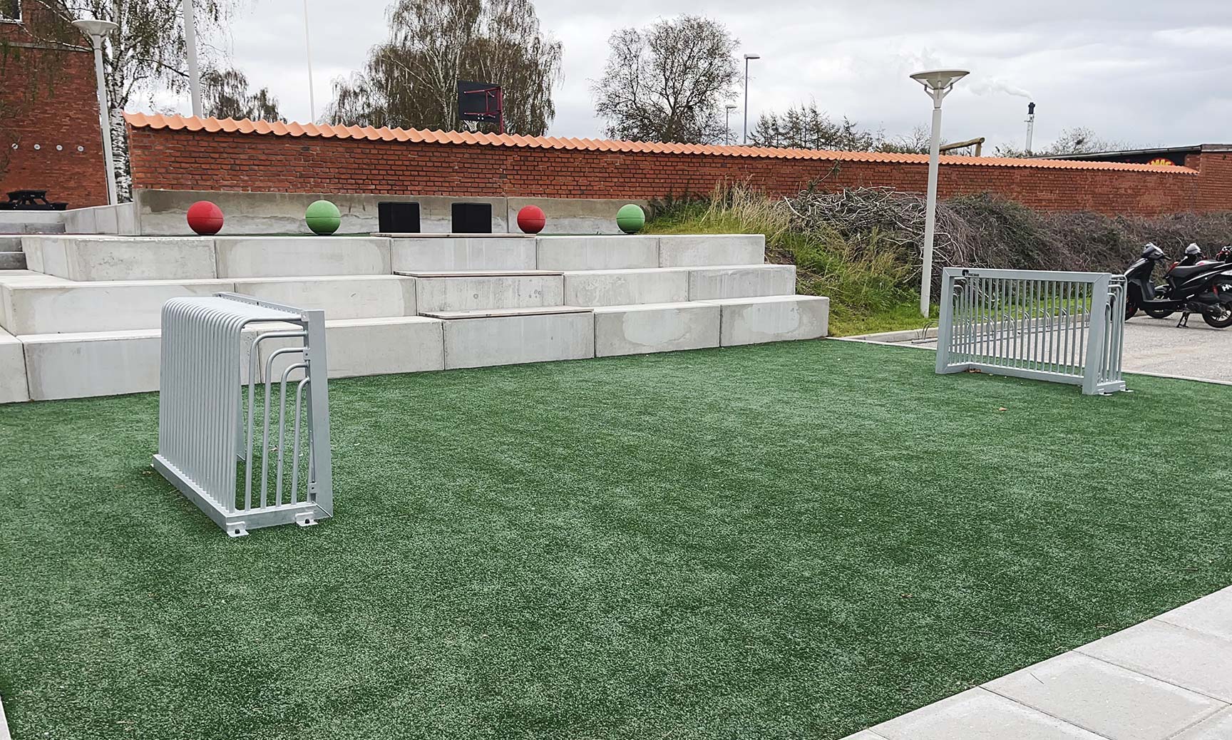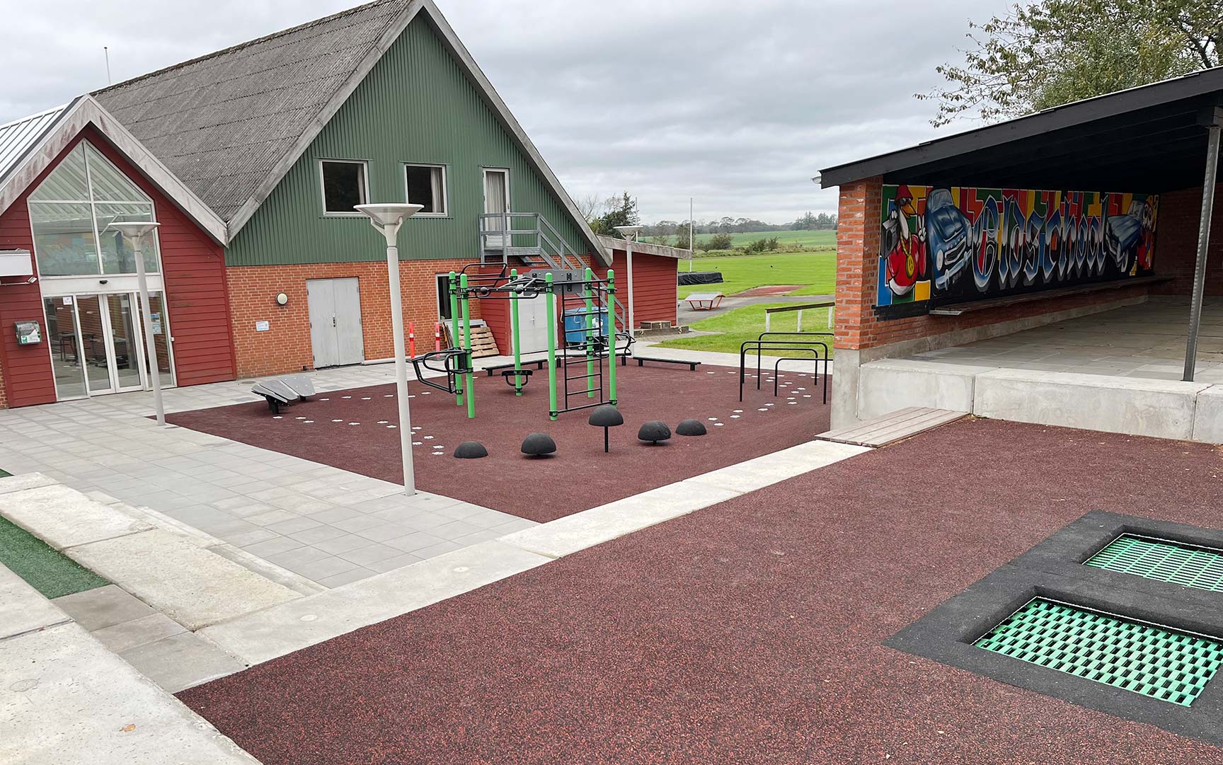 I Dybvad i Danmark ville man skapa en bättre koppling mellan skolan och idrottshallen, som hittills varit åtskilda av staket och mur. Området är nu öppet, tillgängligt och sammanvävt med ett aktivitetsområde, till glädje för både skolans elever och idrottsföreningens dagliga besökare.
