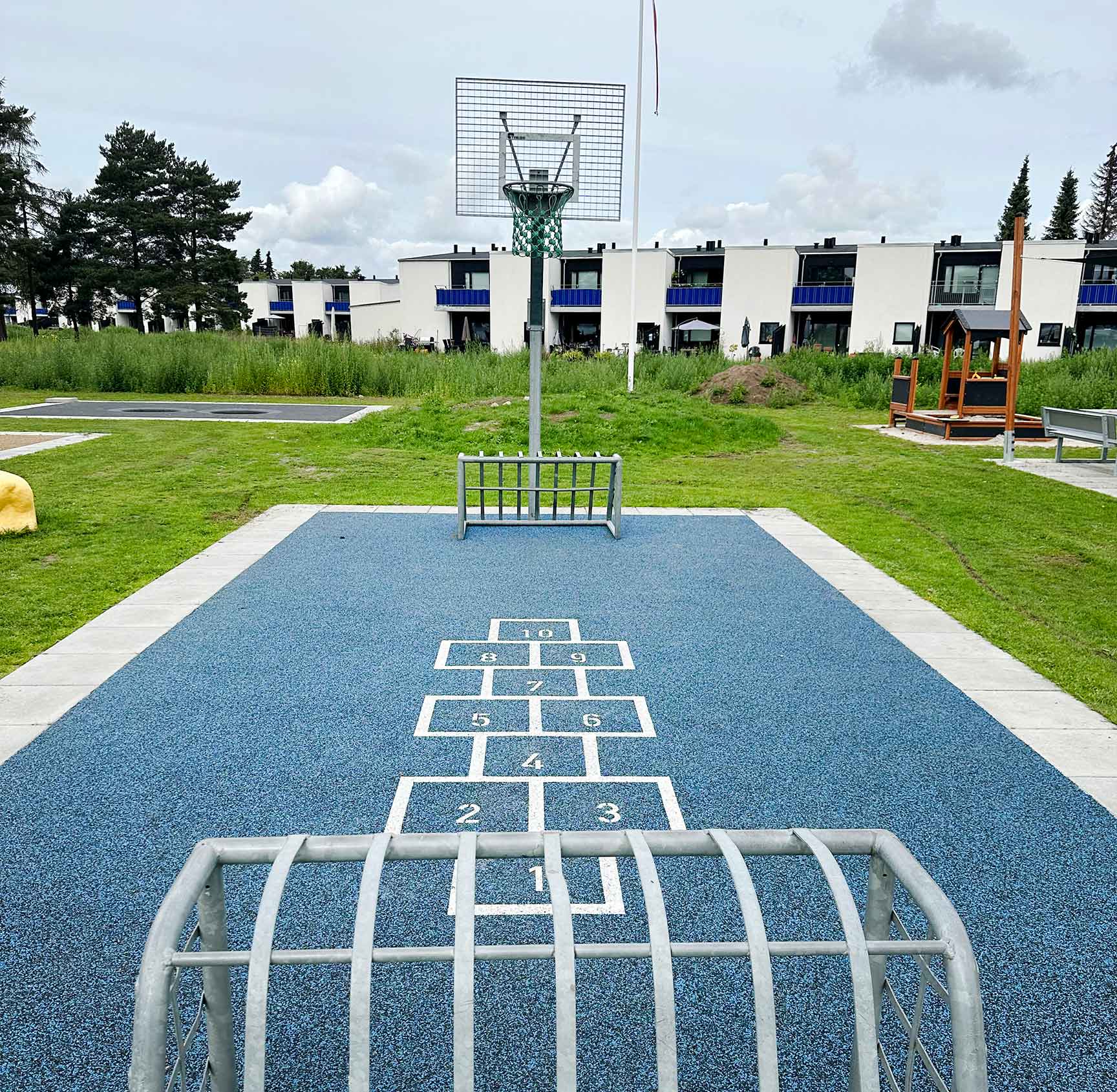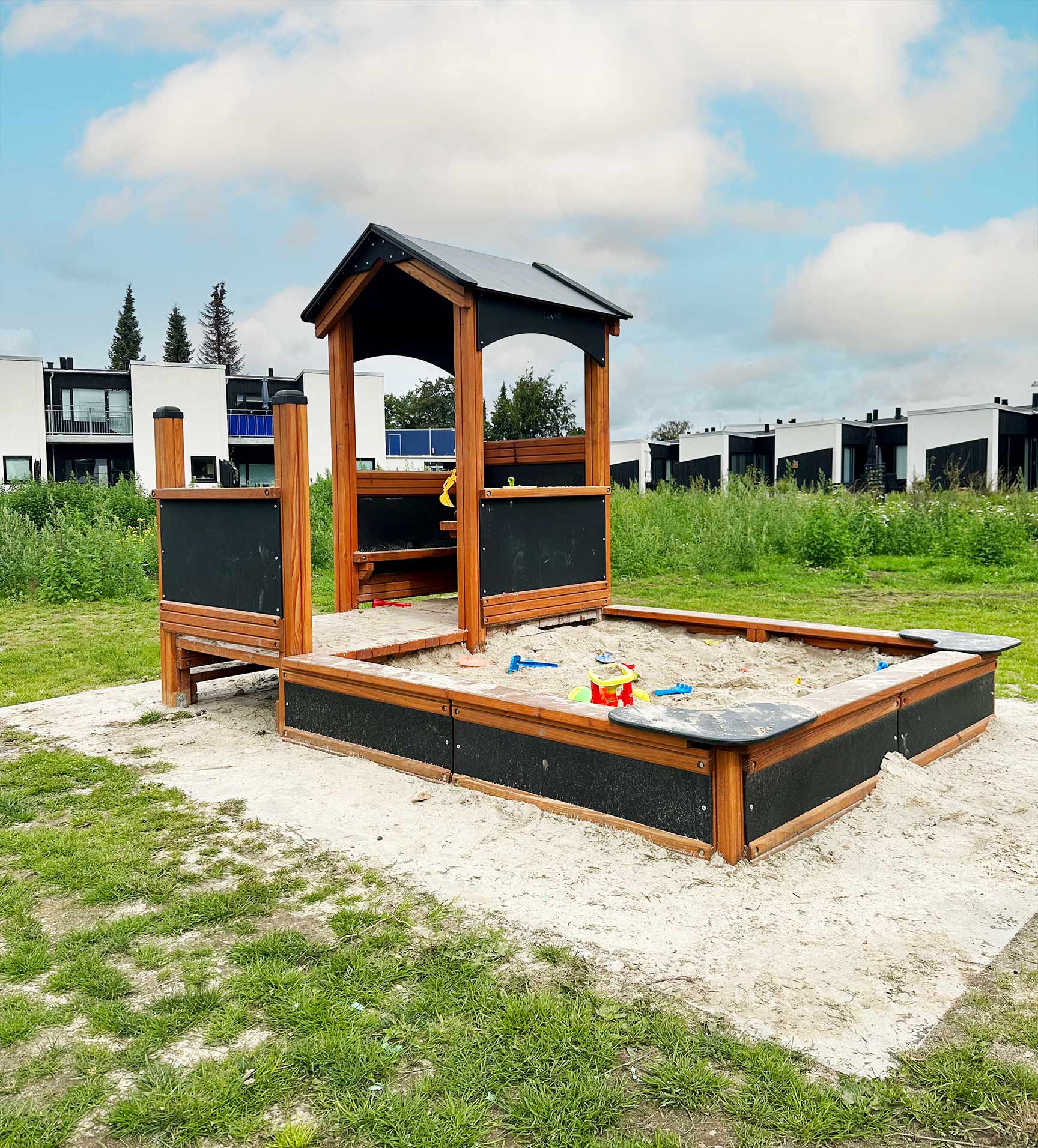 Lekplatsen ritades i samarbete med arkitekten som ansvarade för resten av utemiljöerna i det nya området. Det ger en fantastisk helhetskänsla i hela bostadsområdet.