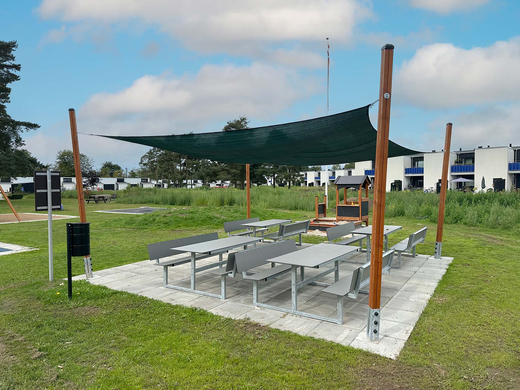 En ö med parkmöbler och solsegel har också skapats, där föräldrarna kan koppla av medan barnen leker. Samtidigt finns här en bra överblick över hela lekplatsen.