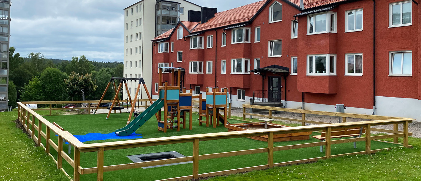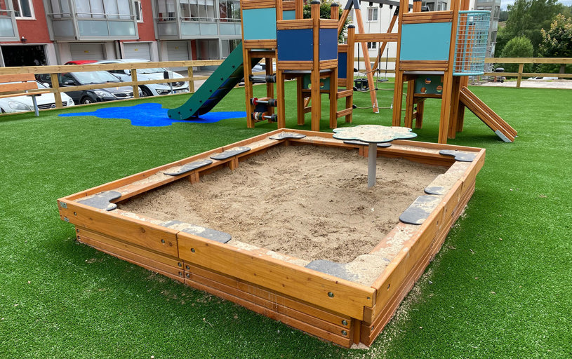 Lekutrustningen smälter fint in i omgivningen tack vare oljebehandlat lärkträ och med detaljer i olika mjuka blå nyanser. Sandlådan med sandbordet är anpassat för de yngsta barnen. En lagom utmanande klätterlek med rutschkana och självklart den omtyckta gungställningen med fågelbogunga till de lite äldre barnen.