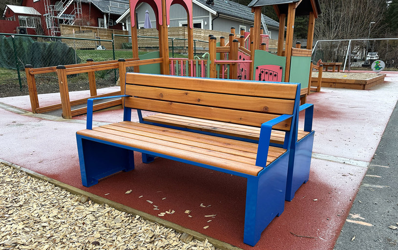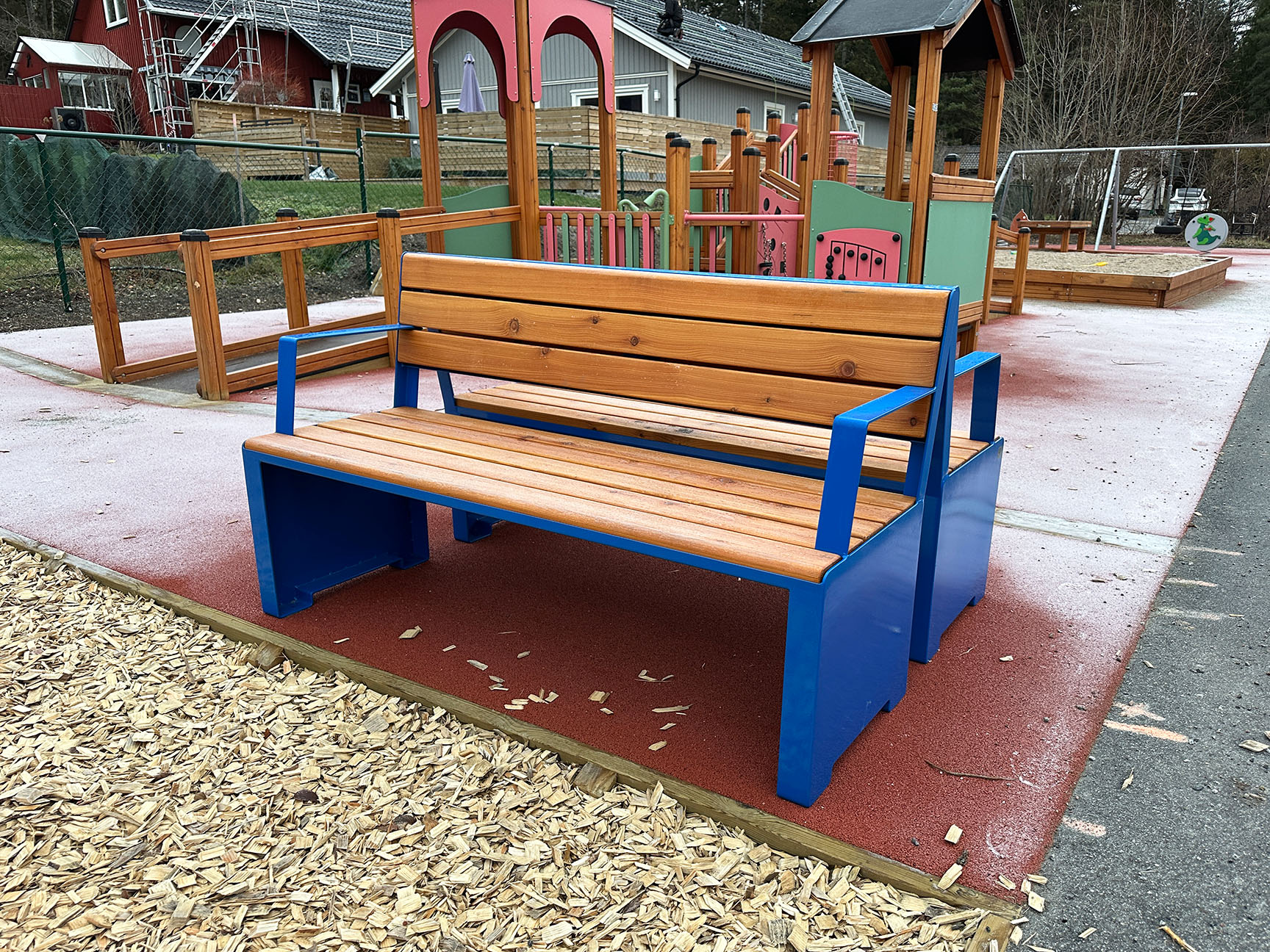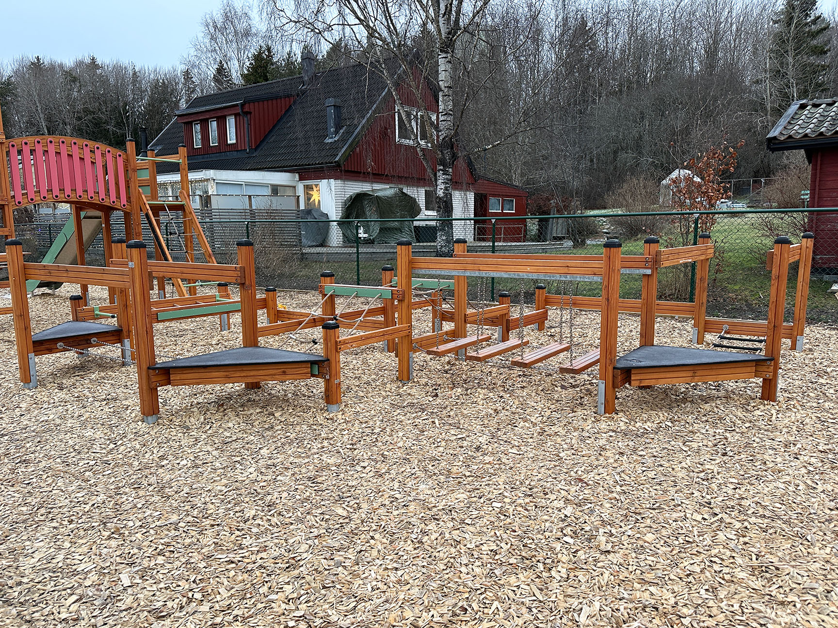 På Morellvägen i Ekerö kommun har vi färdigställt en inbjudande lekplats för alla barnen i närområdet. Den är uppdelad i två halvor; den ena delen innehåller tillgänglighetsanpassad lekutrustning med fallskyddsgummi som underlag. Den andra delen har en klätterställning och balansbana med fallskyddsflis som underlag.