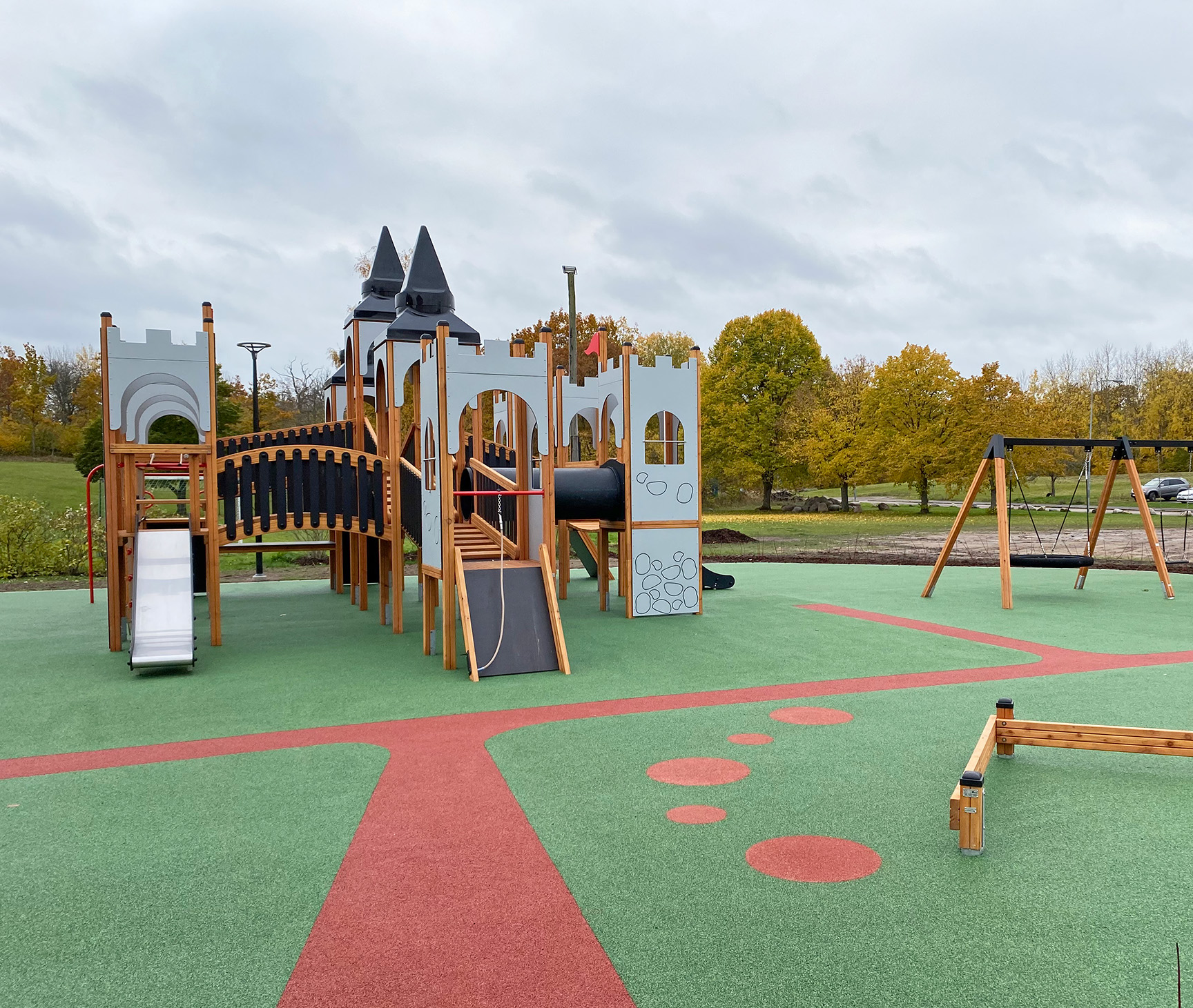 Lekplatsen fick nytt fallunderlag med färgglatt fallskyddsgummi. På det inspirerande mönstret kan barnen springa på stigar från gungorna och balansbommen vidare till slottet för mer lek och bus.