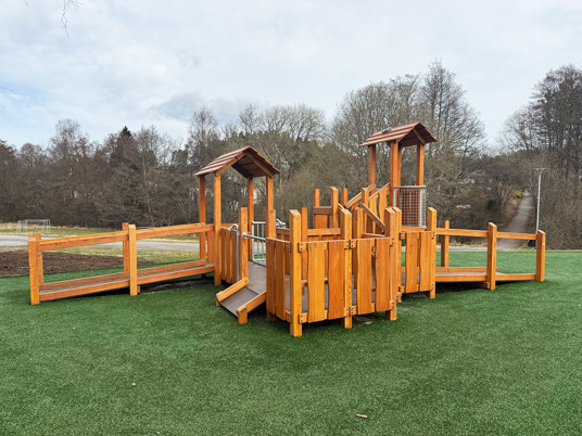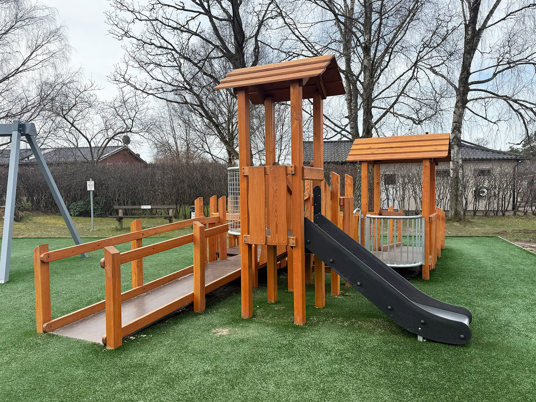 Det slitstarka konstgräset gör lekplatsen lätt att nå och använda, oavsett hur du tar dig fram. Tack vare genomtänkta lösningar, som den tillgänglighetsanpassade lekställningen Alla Kan Gamma, kan alla barn delta på sina egna villkor.
