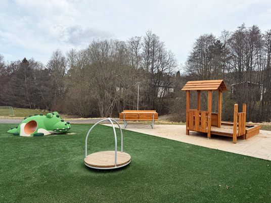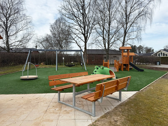 Lekplatsen är kompakt och överblickbar – perfekt för familjer med barn i olika åldrar. Här kan barnen leka fritt medan vuxna kopplar av vid det trevliga picknickbordet i lärkträ och stål. En plats för både aktivitet och avkoppling.