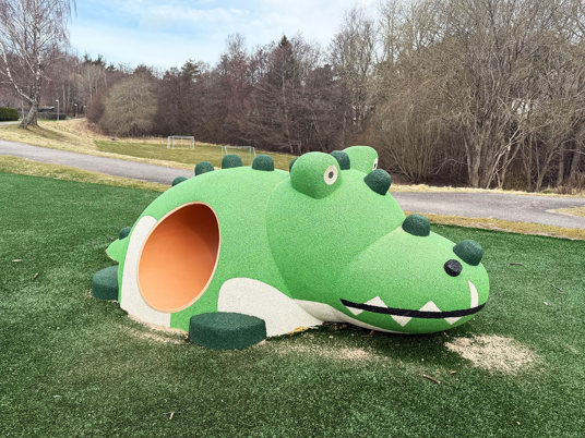 Den grönskande ytan och variationen i lekutrustningen gör platsen till en naturlig samlingspunkt för både stora och små. Här finns allt från rutschkana, klätterställning och gungor till balansutmaningar och fantasifulla gummidjur – en plats som lockar till lek året runt.