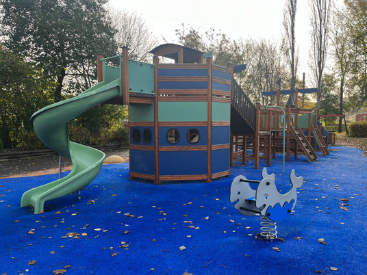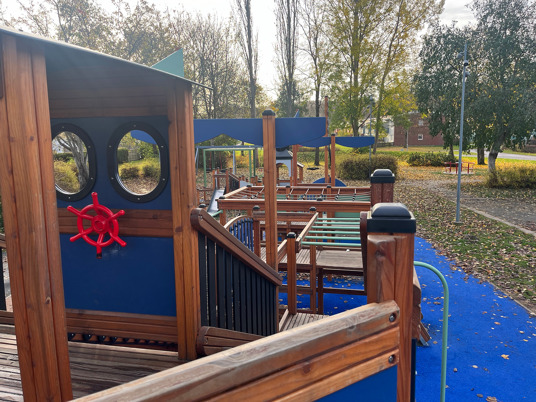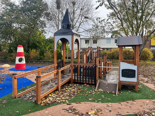 Hela lekplatsen är utformad med tillgänglighet i fokus. Från sandlådan i fören och karusellen där alla kan vara med, till den riddar-inspirerade lekställningen som är möjlig att nå med rullstol – här kan alla delta på sina villkor.