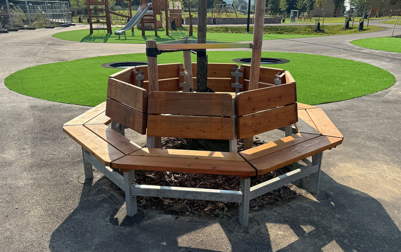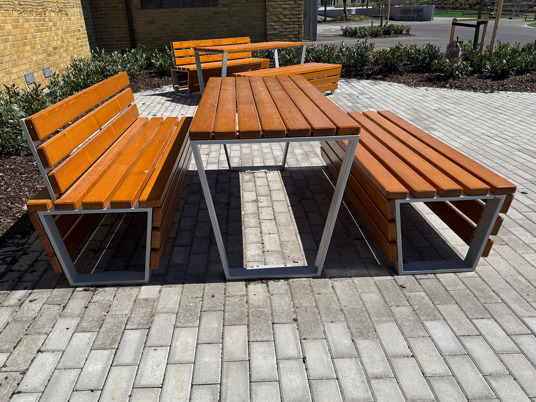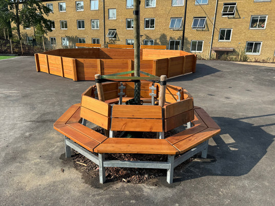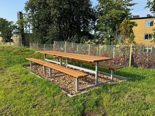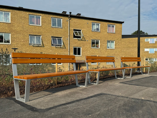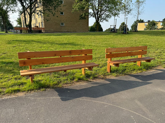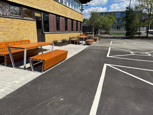 Skolgården kompletteras med flera typer av parkmöbler – bänkar, soffor, bänkbord och trädsoffor – som ger plats för både återhämtning, samtal och pedagogiska pauser utomhus. En genomtänkt parkmiljö som stödjer skolans vardag, hela dagen.