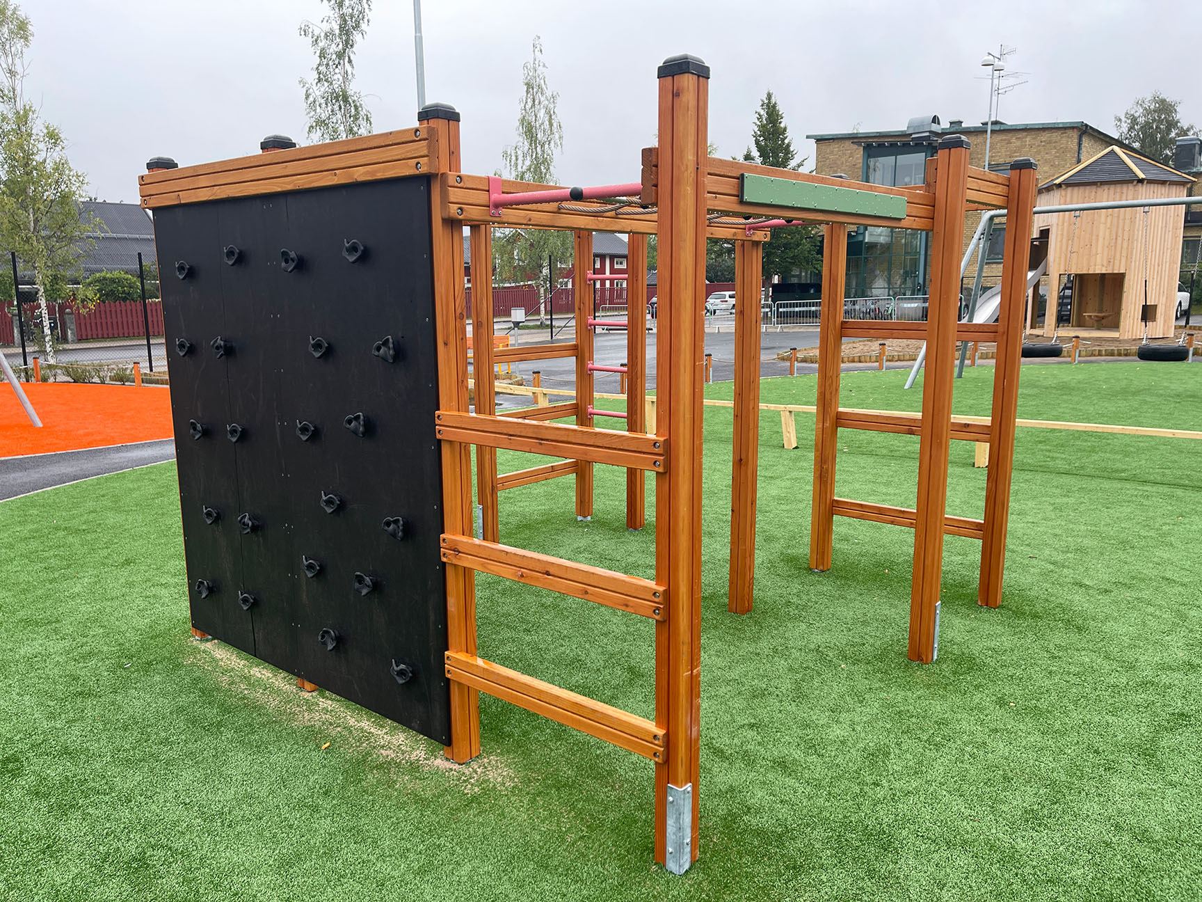 En fantastisk varierande skolgård med olika rum för olika aktiviteter. Underlagen skiftar mellan färgrikt konstgräs, riktigt gräs, asfalt och fin stenläggning.