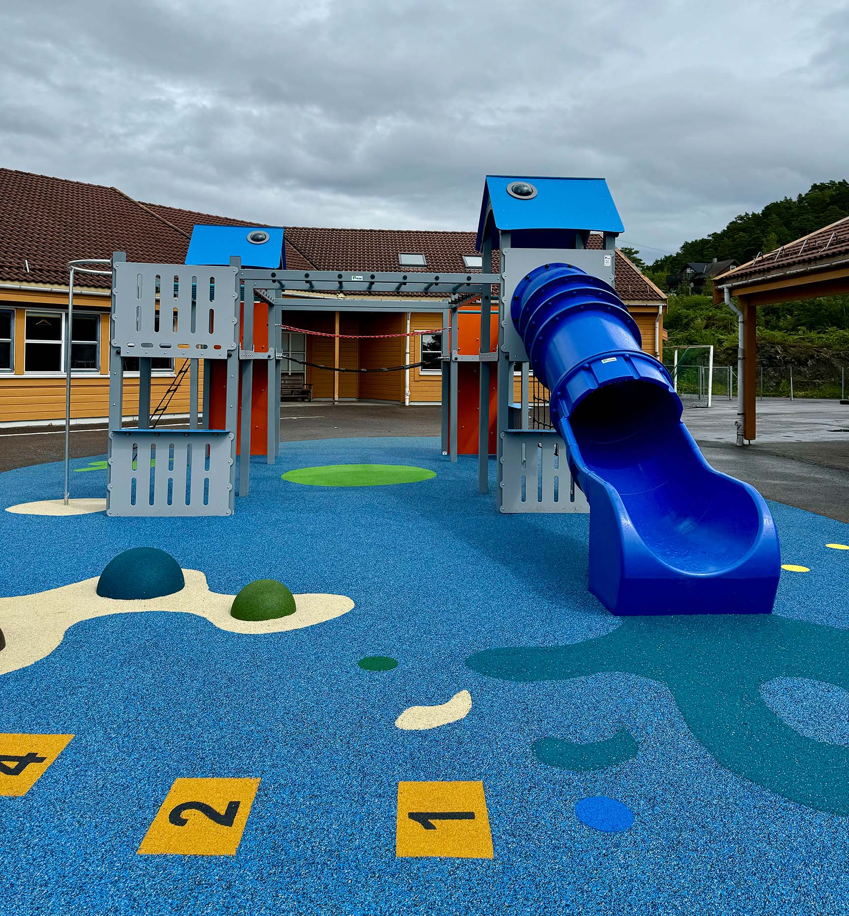 Strøno skola, i Bjørnafjordens kommun i Norge, har nyligen fått en fantastisk uppgradering av skolgården med nya lekredskap och ett innovativt fallunderlag med spel, levererat av Tress.