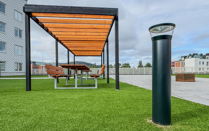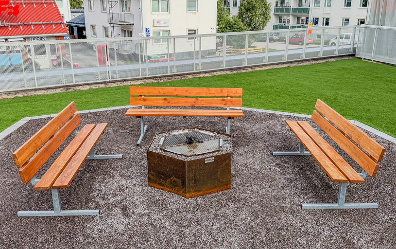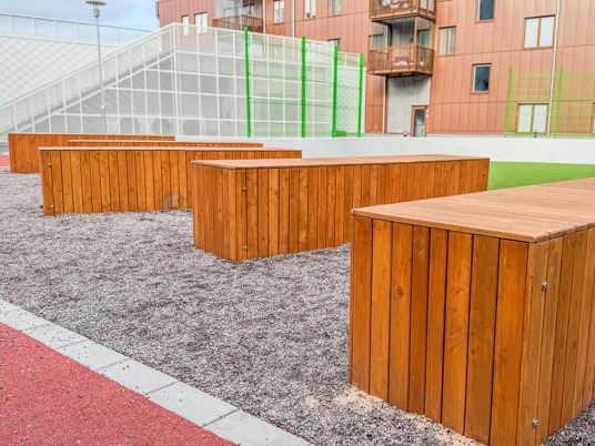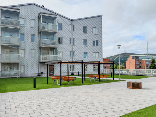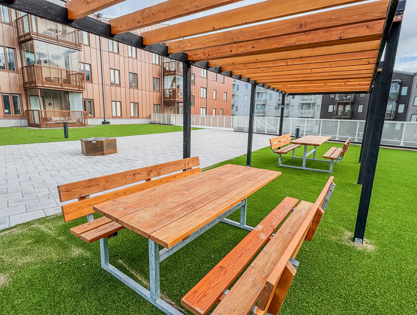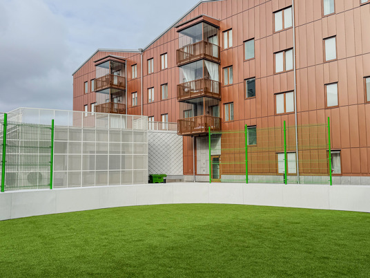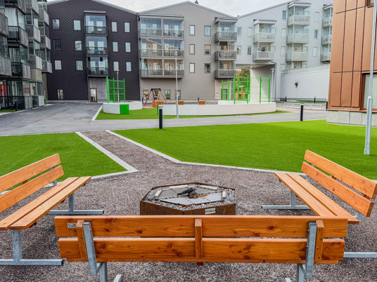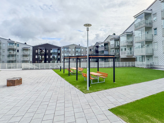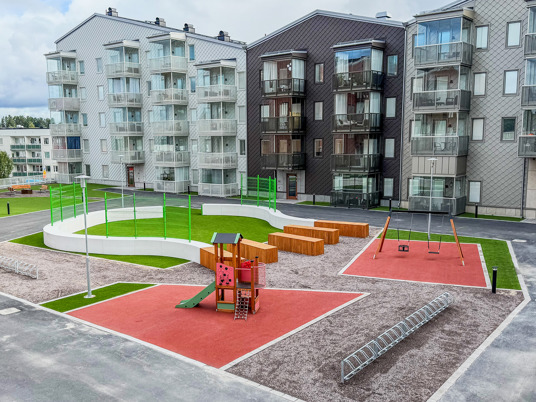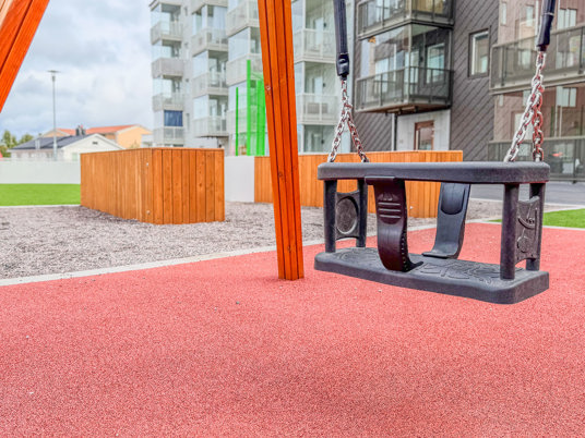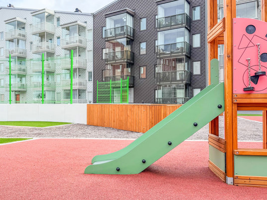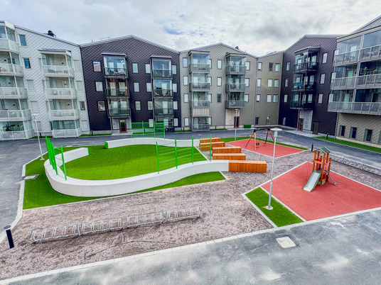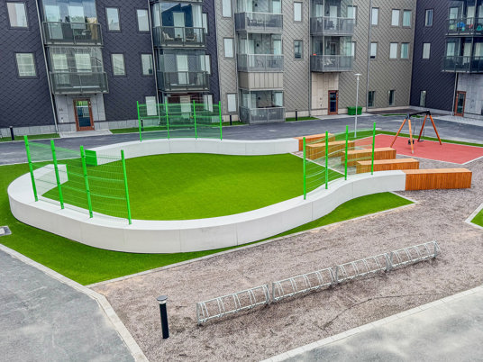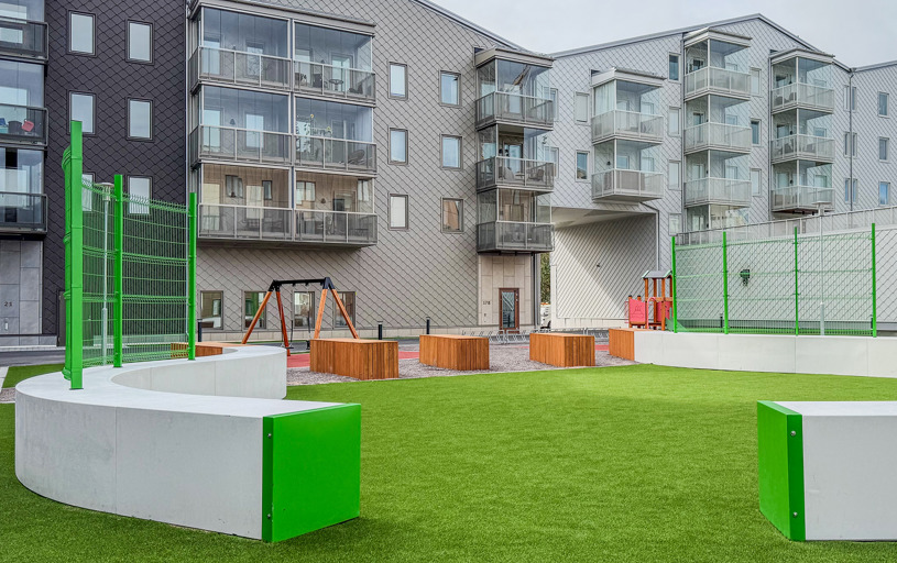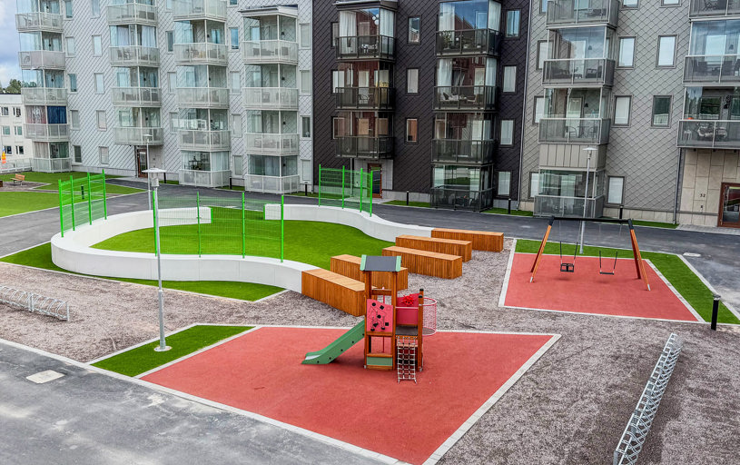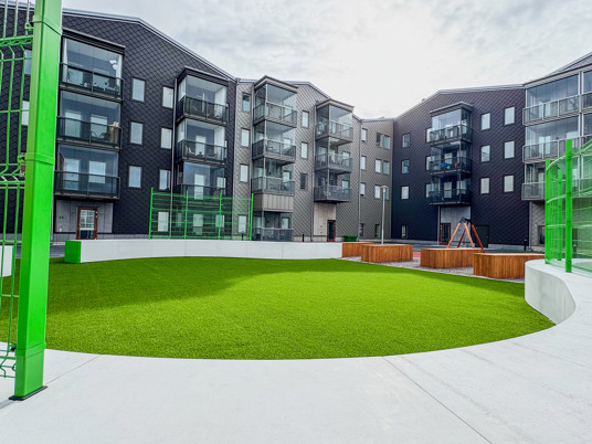 När du kliver in på innergården möts du av ett färgstarkt fallskyddsgummi och det krispigt gröna konstgräset. Det är både estetiskt tilltalande och lättskött året runt, där valet av konstgräs närmast husen underlättar snöskottningen, som inte förstör gräsmattan. Sommartid kräver ytan minimalt med underhåll, perfekt med en ständigt grön gräsmatta, oavsett slitage eller väderlek.