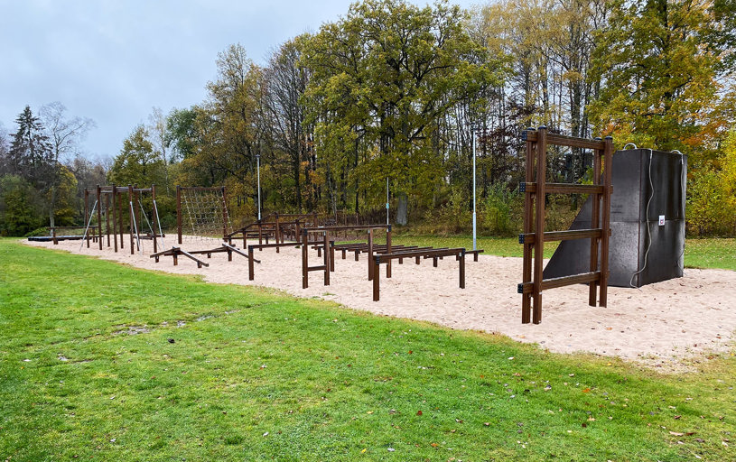 Utegymmet är utrustat med åtta olika träningsstationer. Här kan du bland annat göra knäbök, dips, sit-ups och axelpress. Perfekt att avsluta en joggingrunda i skogen med ett pass på utegymmet!