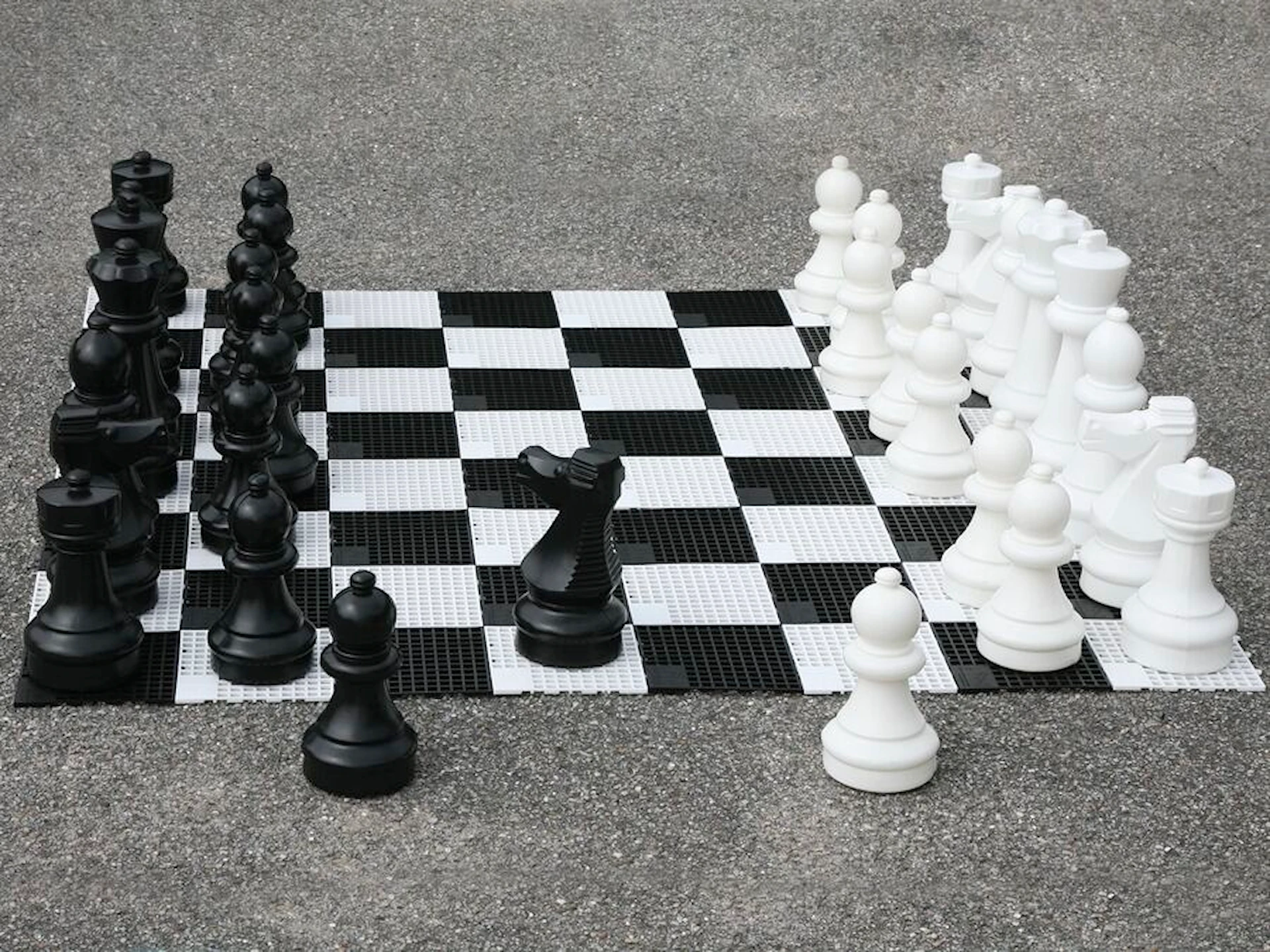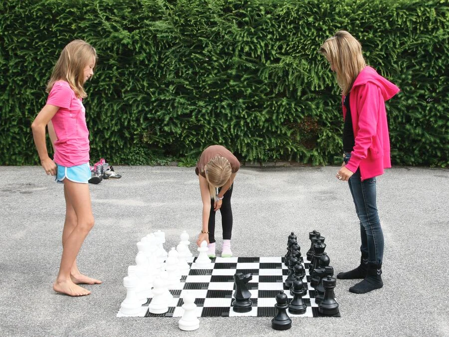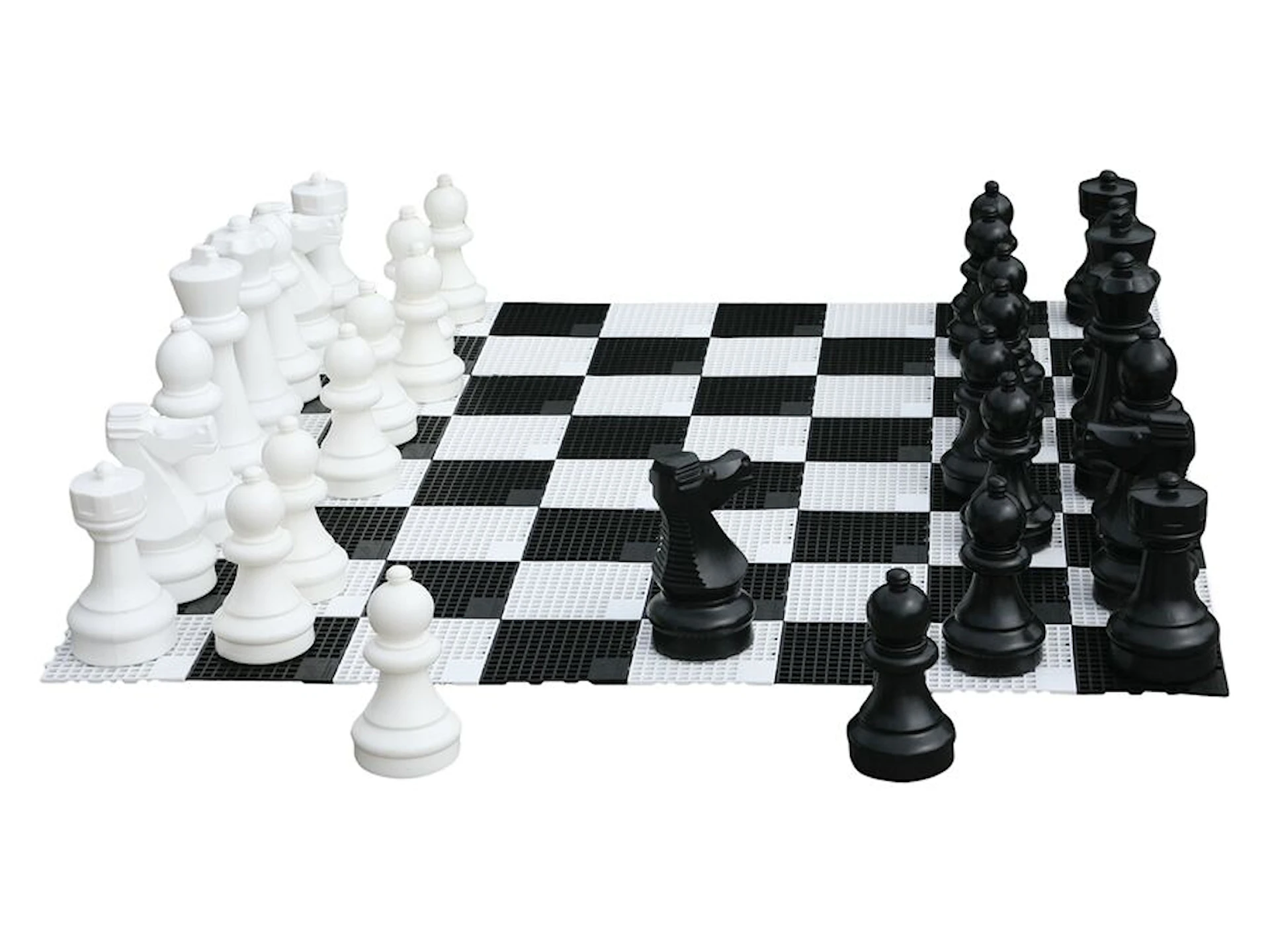 Pjäserna är tillverkade av slitstarkt plastmaterial som tål utomhusmiljöer, och deras storlek gör dem lätta för barn att hantera. Höjden varierar från 20 cm (bönder) till 30 cm (kung), och de flesta pjäser har en bas med en diameter på cirka 11 cm.