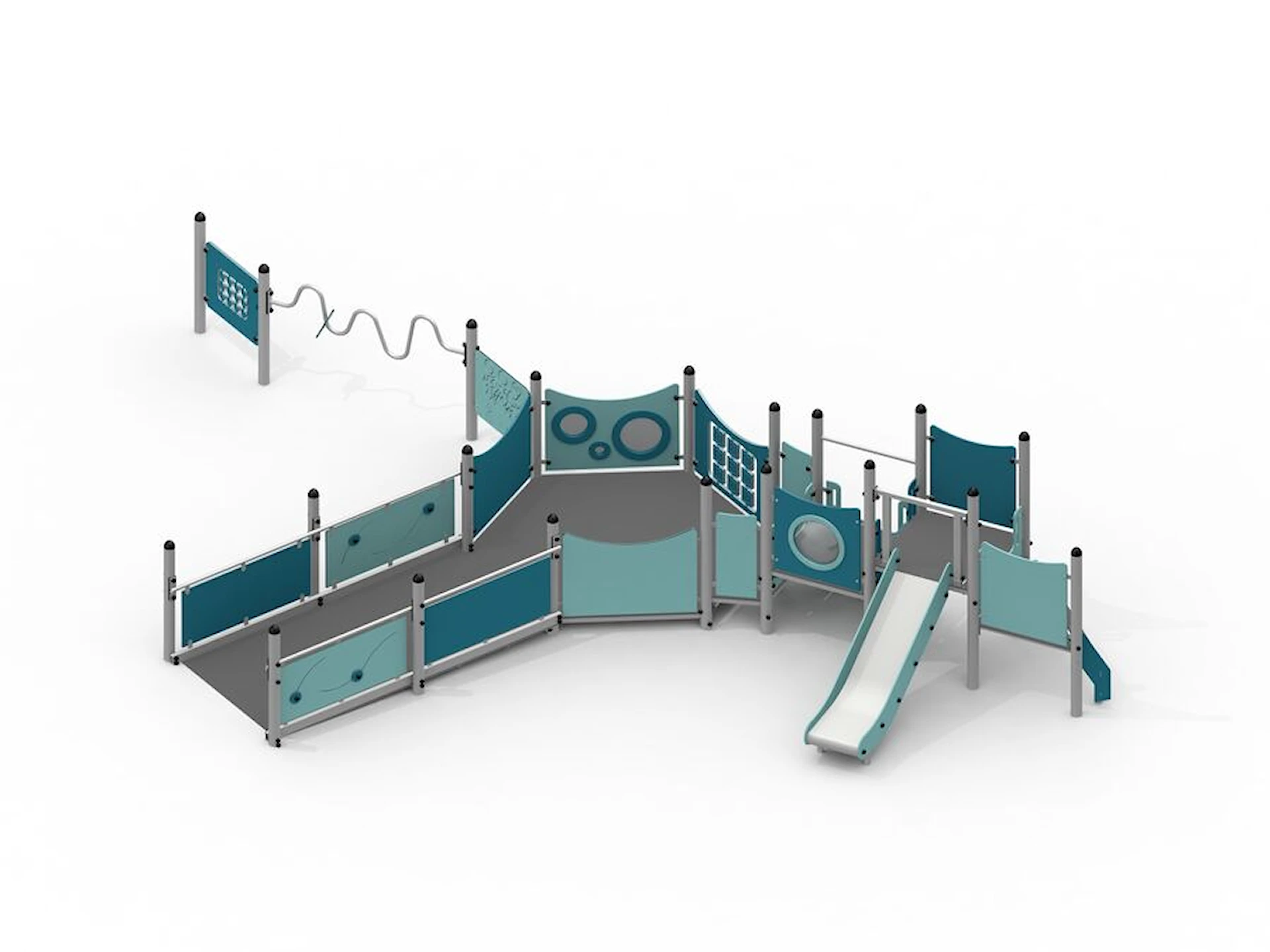 Perseus är utformad med breda ramper, generösa plattformar och tydliga rörelsevägar som gör det enkelt att ta sig fram, både gående och rullande. Lekställningen innehåller flera tillgängliga lekmoment som stimulerar rollekar, samarbete och social interaktion. Den integrerade rutschkanan ger extra fartfylld glädje och blir ett naturligt nav i leken.