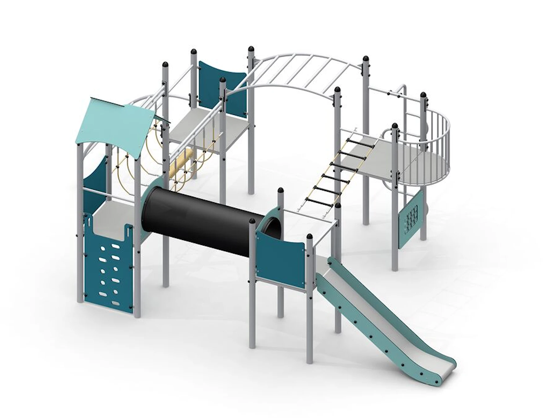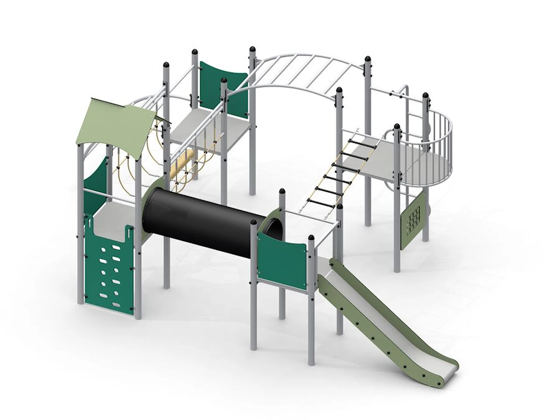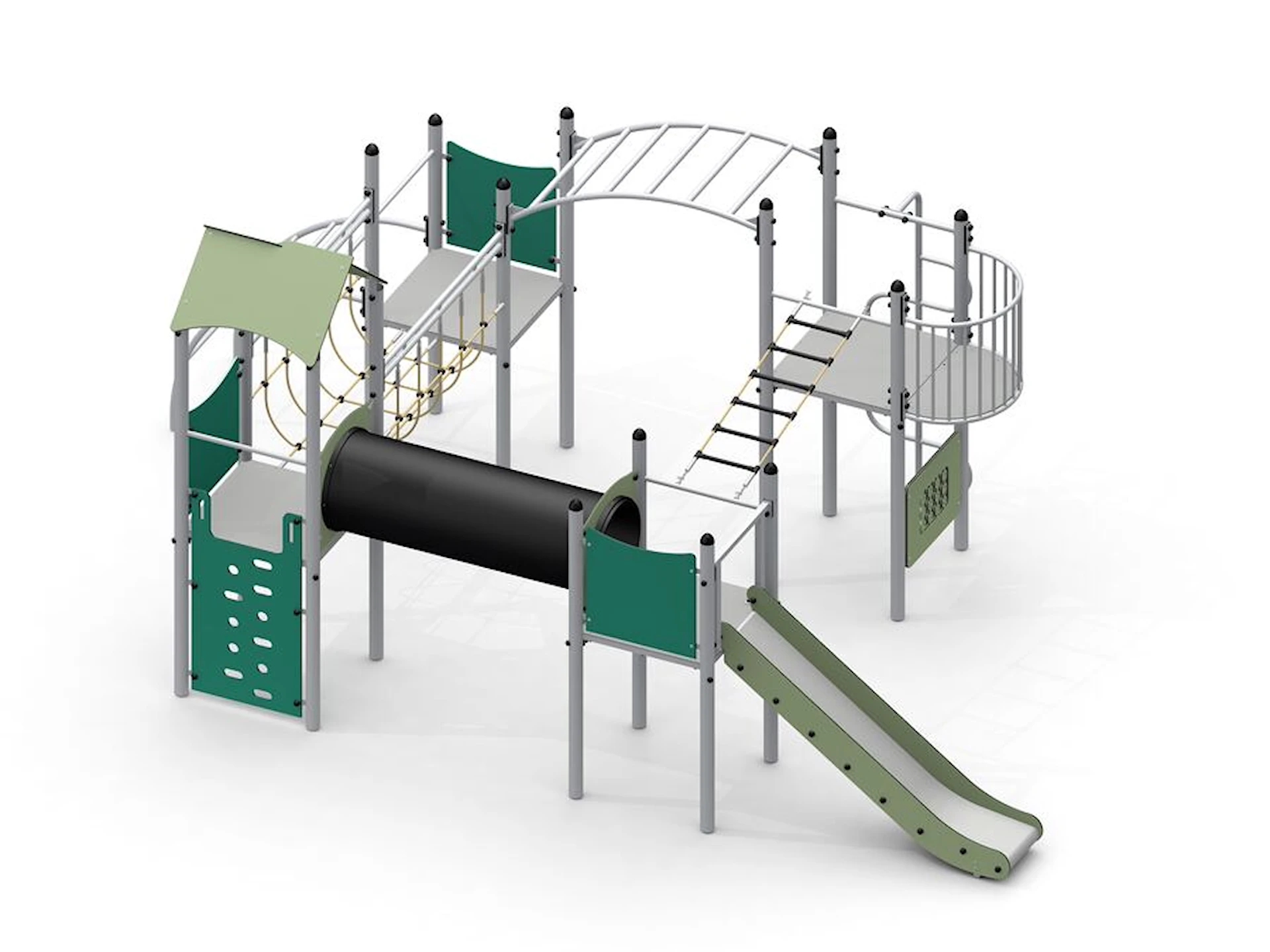 Rutschbanan ger fartfylld lek och blir en naturlig samlingspunkt, samtidigt som de olika nivåerna och vägarna genom lekställningen inspirerar till rollekar och fantasi. Konstruktionen är öppen och överskådlig, vilket gör det enkelt för barn att orientera sig och tryggt delta i leken.