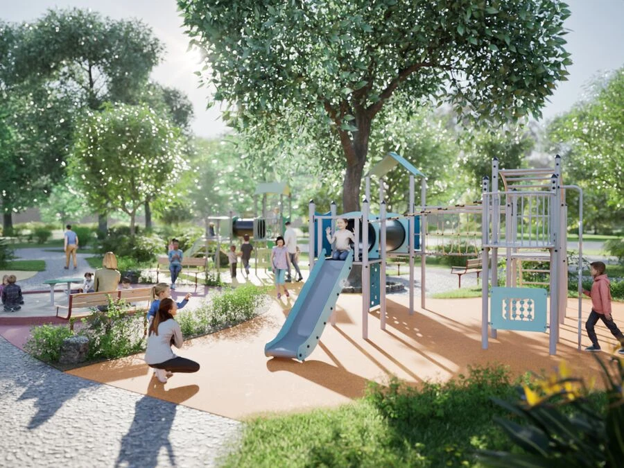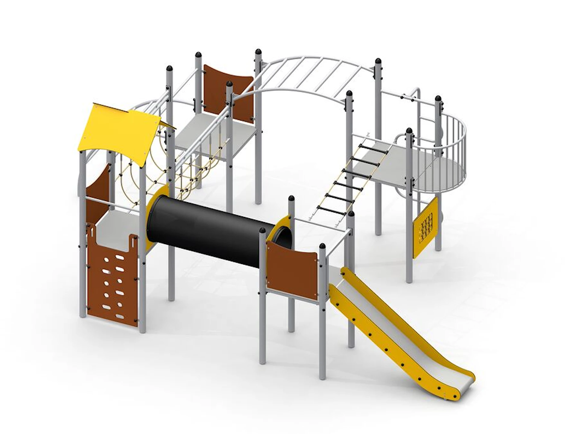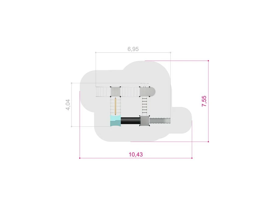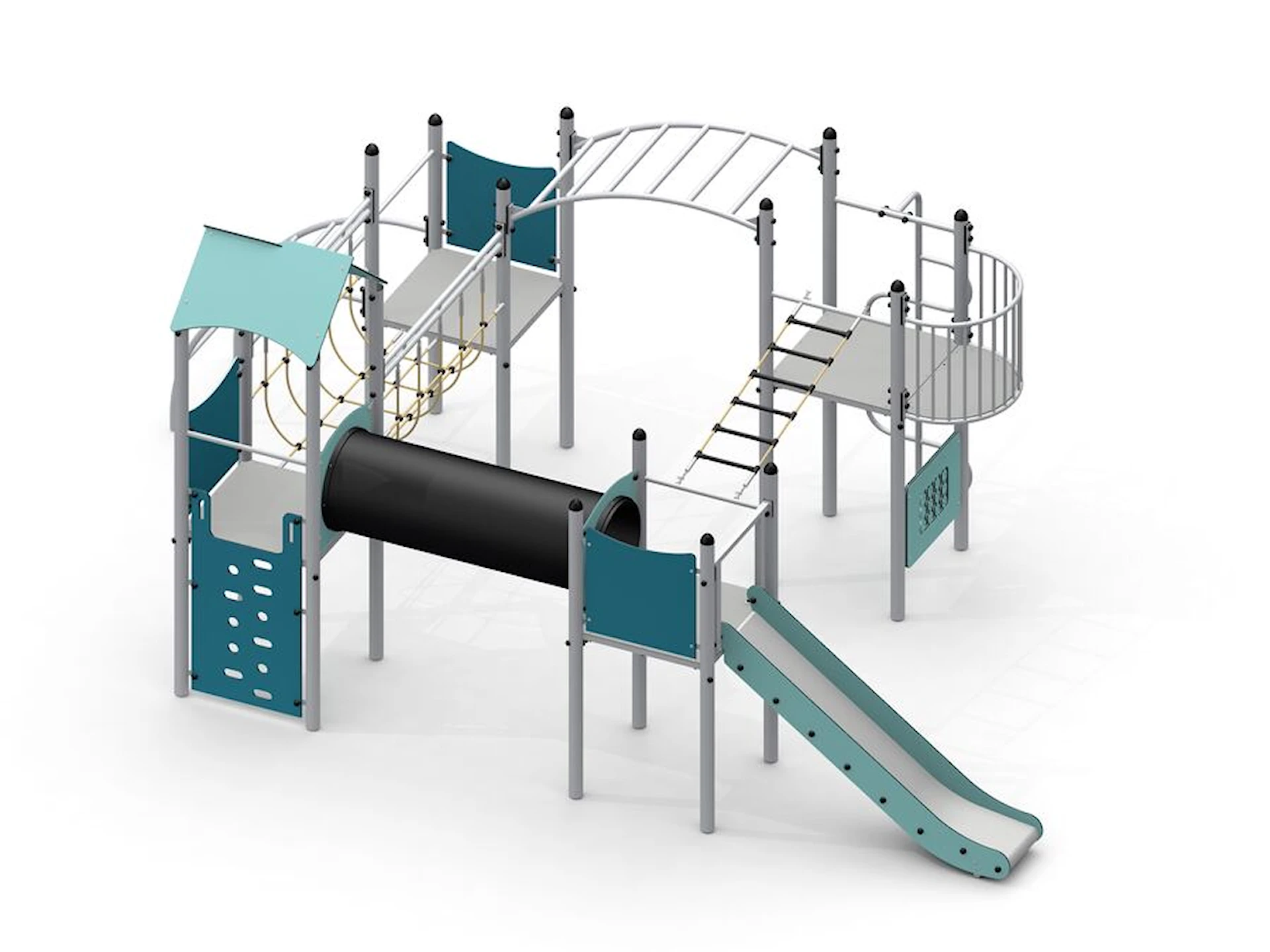 Rutschbanan ger fartfylld lek och blir en naturlig samlingspunkt, samtidigt som de olika nivåerna och vägarna genom lekställningen inspirerar till rollekar och fantasi. Konstruktionen är öppen och överskådlig, vilket gör det enkelt för barn att orientera sig och tryggt delta i leken.
