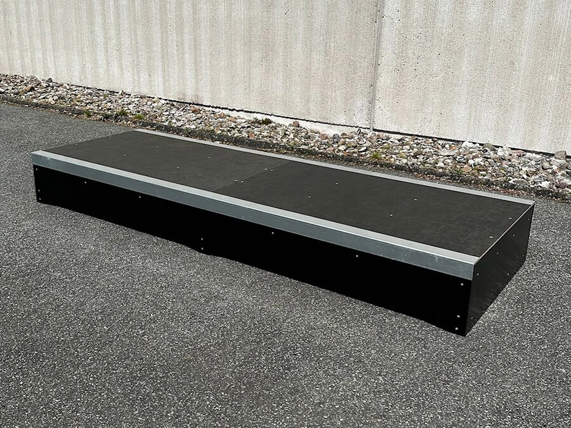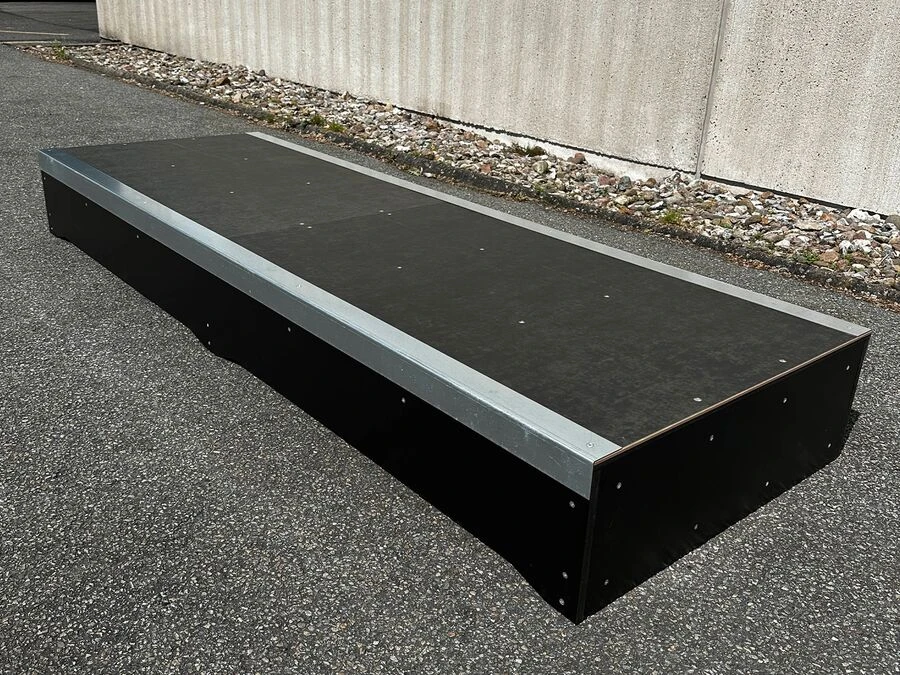 I botten finns utskurna handtag som gör den enkel att flytta. Konstruktionen är både robust och stabil, och materialen är noggrant utvalda för lång hållbarhet utomhus: kompositplattor, tryckimpregnerat trä, varmförzinkad coping och ytbehandlade skruvar.