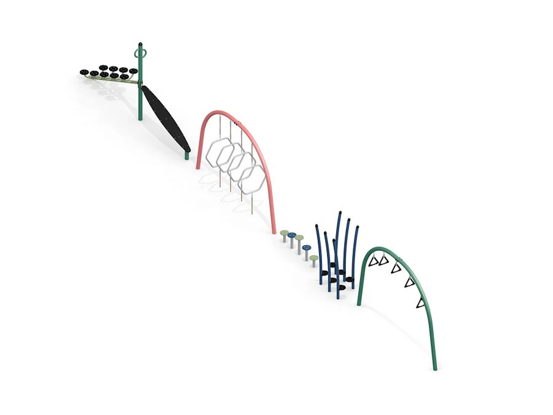 Balansbanan består av samma utvecklande delar som den cirkelformade varianten, med bland annat balanssteg, stolphopp, greppmoment och klättring. Kombinationen av rörelse och variation tränar barnens balans, styrka, koordination och kroppsmedvetenhet på ett naturligt och lekfullt sätt.