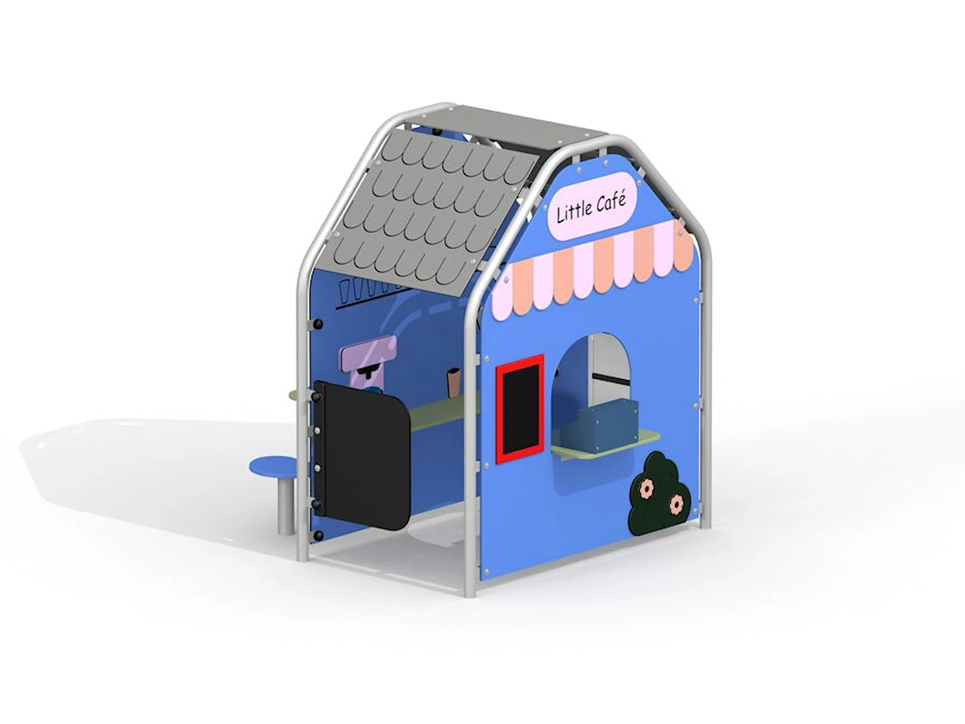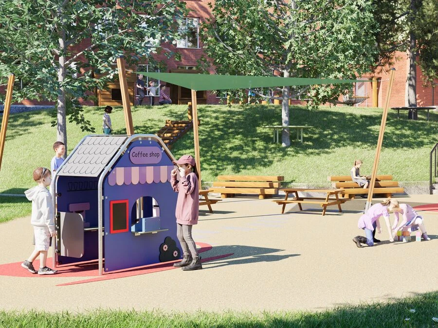 De fysiska aktiviteterna med att öppna, servera och hantera de fastmonterade delarna stärker finmotoriken och bidrar till utveckling av samarbetsförmågan. Caféet Lekhus är byggt i robusta material som tål utomhusbruk året runt och kräver minimalt underhåll.