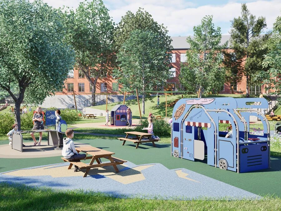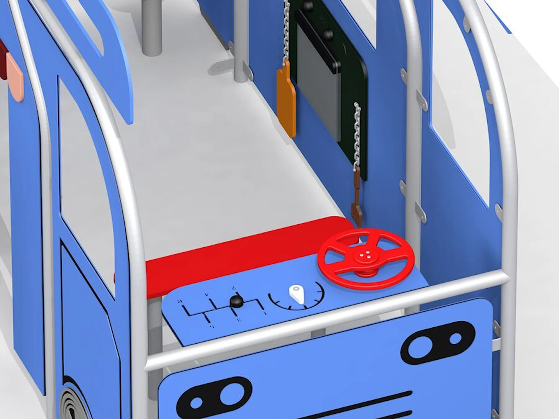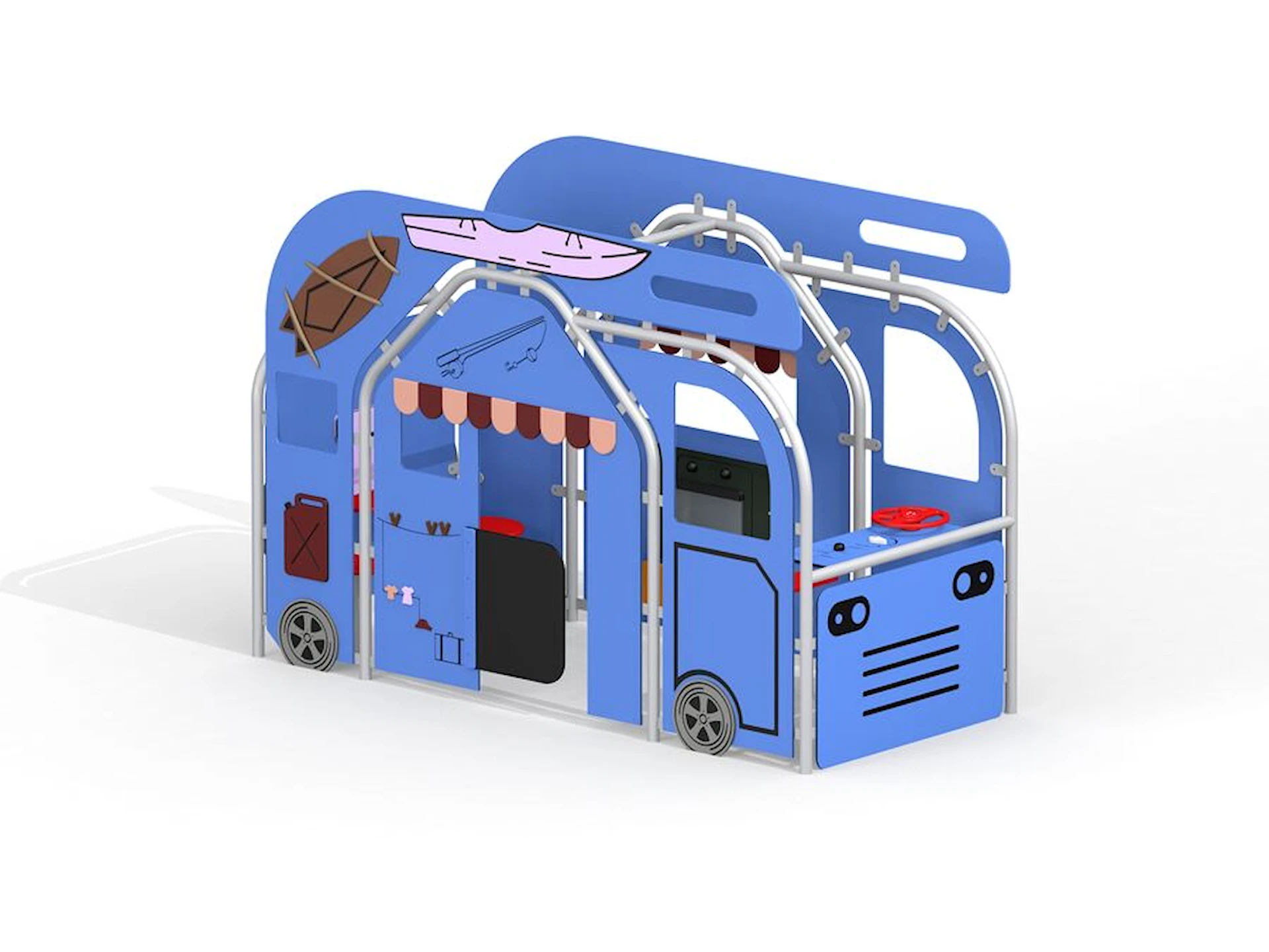 Den öppna konstruktionen gör det enkelt att gå in och ut, och det finns plats för flera barn samtidigt. Lekfordonet Husbilen är byggt i slitstarka material som tål utomhusbruk året runt och kräver minimalt underhåll.