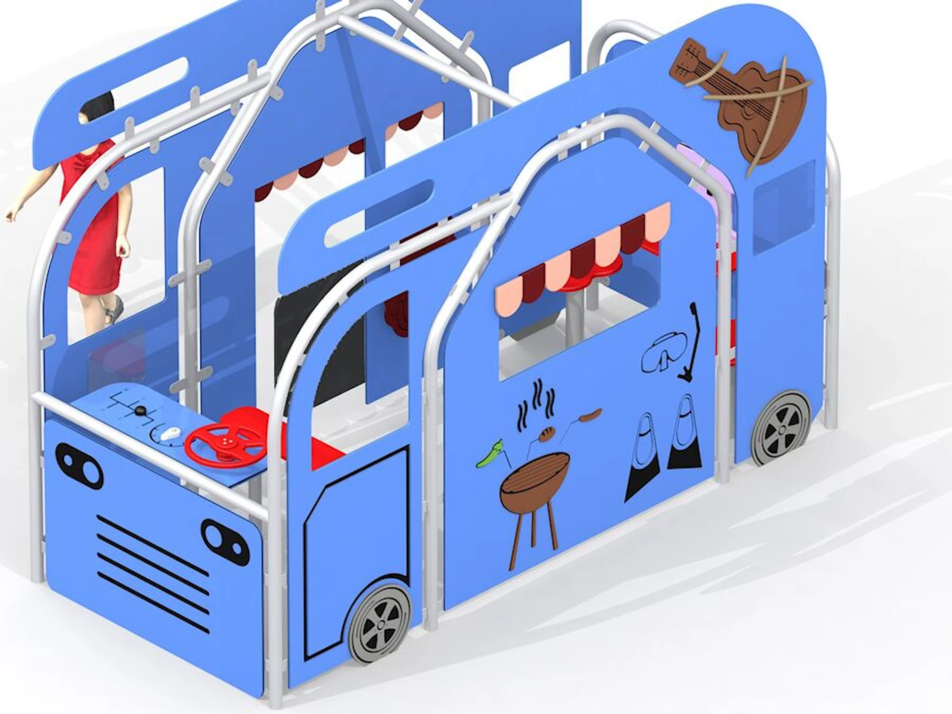 De grafiska motiven som grill, cykel och gitarr inspirerar till fantasi och berättande, medan ratt och rörliga delar stärker både fin- och grovmotoriken. När flera barn leker tillsammans i husbilen uppstår samarbete, social interaktion och rollfördelning.