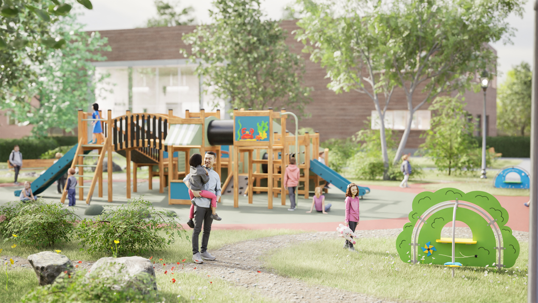Lekpanelen fungerar utmärkt som ett fristående lekelement eller som en del av en större lekplatsmiljö. Den lekfulla designen och de mjuka formerna gör den lättillgänglig för yngre barn och passar väl in på både förskolegårdar och offentliga lekmiljöer.