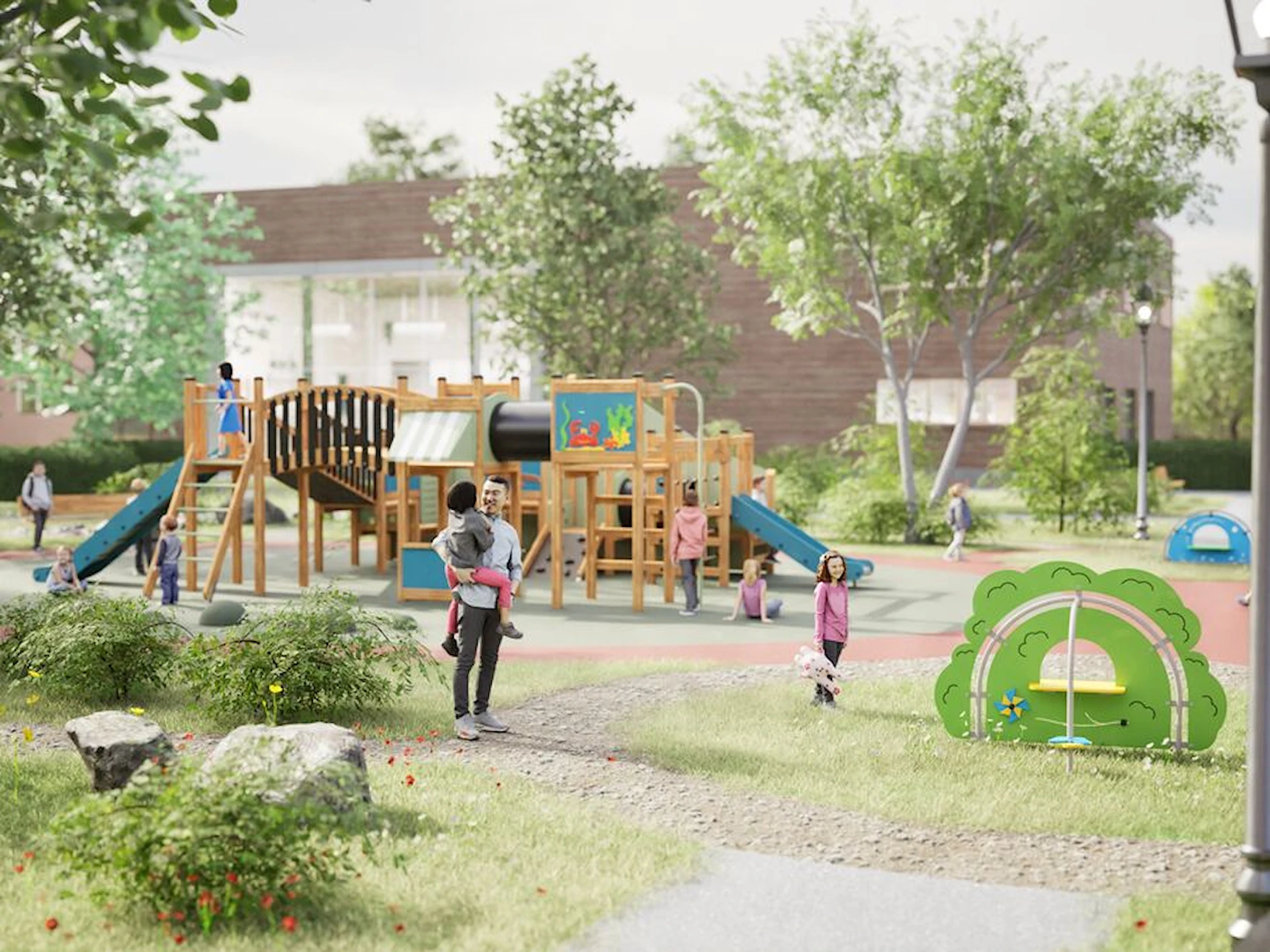 Det snurrande vindhjulet fungerar både som ett lekfullt inslag och som en visuell detalj som lockar till rörelse, utforskande och samtal. Kombinationen av form, färg och interaktiva detaljer stimulerar fantasin och uppmuntrar social lek mellan flera barn samtidigt.