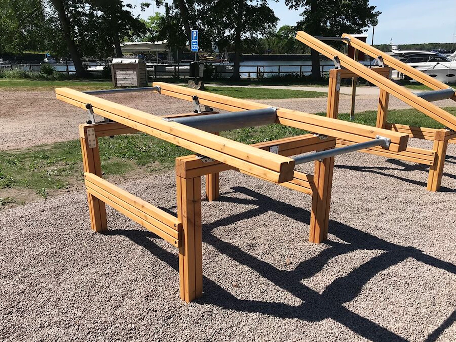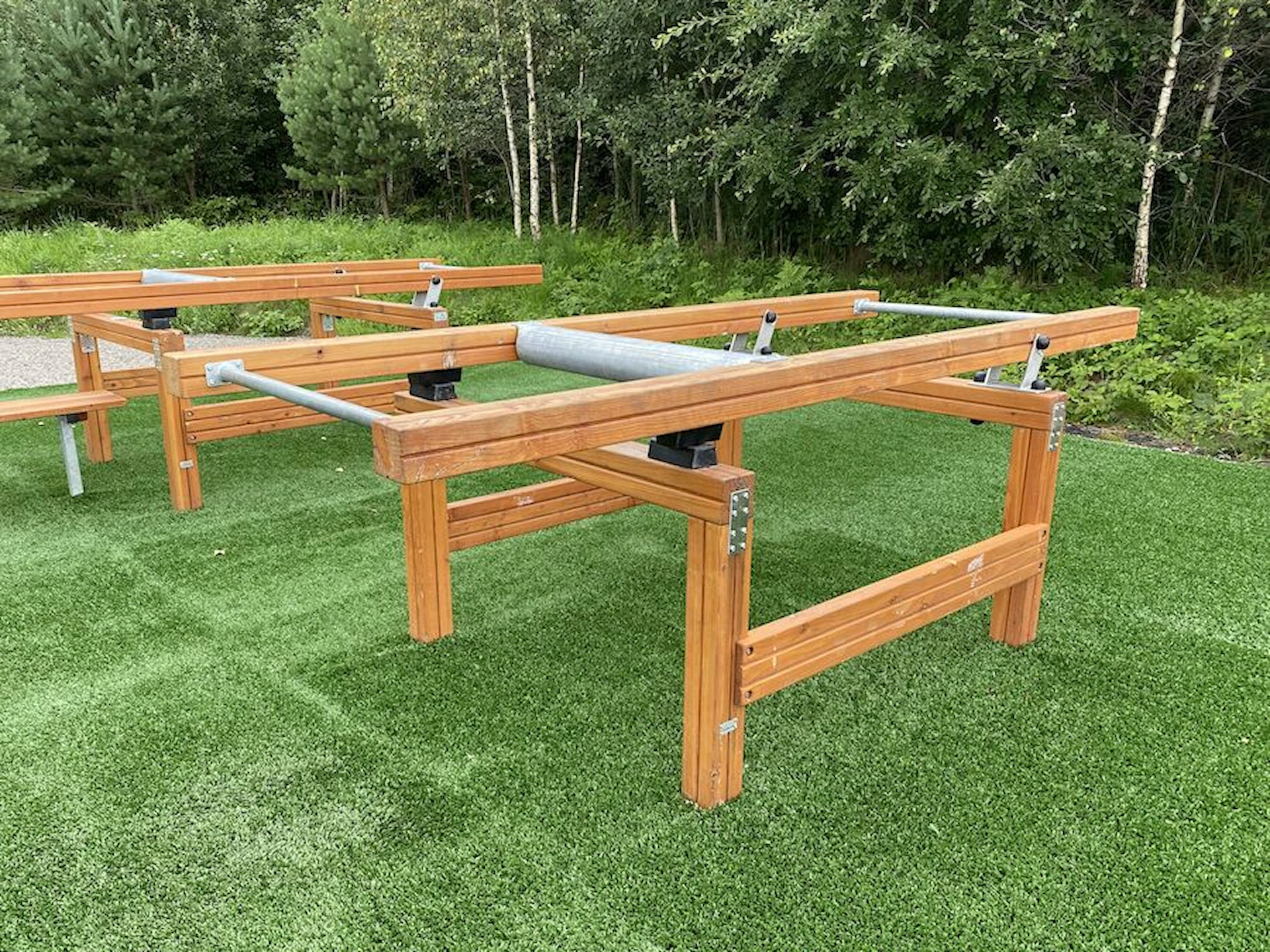 Däremot har vi många produkter utan trä som kan levereras i stort sett omgående, exempelvis Boulder Rocks, gungor, mål, basket, bordtennis, fristående rutschar, klätternät, studsmattor, bänkbord med mera.